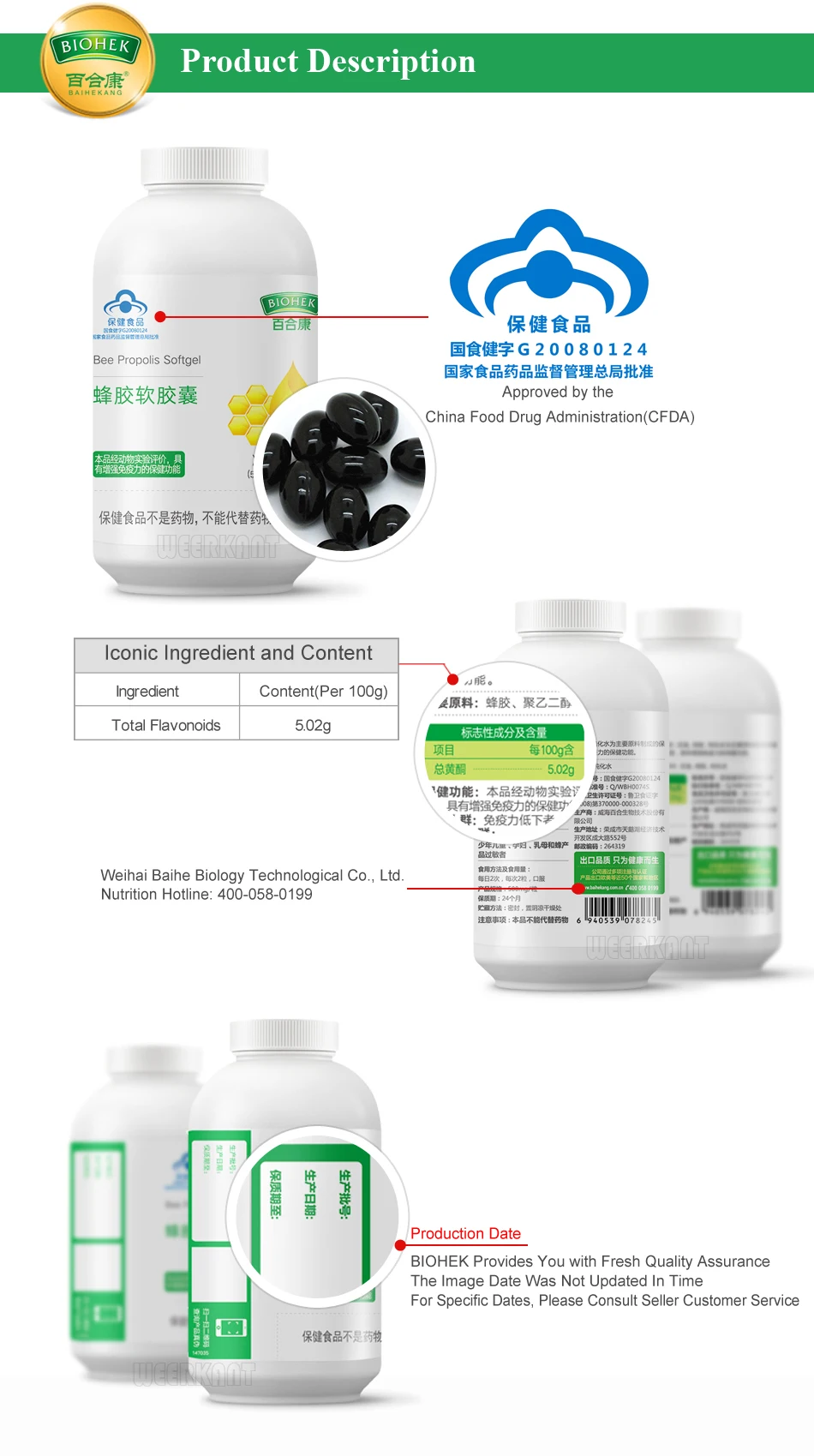 Название продукта: пчелиный прополис, мягкие гелиИнгредиент: прополис, ПОЛИЭТИЛЕНГЛИКОЛЬ 400, желатин, глицерин, очищенная водаЭффективный состав и содержание на 100 г: всего ароматизаторов 5,02 гИспользование и дозировка: 2 раза в день, каждый раз 2 мягких геляХарактеристики продукта: 500 мг * 80 мягких гелейСрок действия: 24 месяца.Функция продукта:1. Повышает иммунитет, анти-опухоль.2. Играет роль в регулировании уровня сахара в крови.3. Противовоспалительное, антибактериальное, Противовирусное действие.4, может устранить свободные радикалы, ингибирующие перекисание липидов, уменьшить жир в крови и холестерин, некоторые компоненты которых могут ингибировать агрегацию тромбоцитов, селективное связывание с связью стенки кровеносных сосудов, играет роль антитромботика, в то время как вы можете настроить капиллярную хрупкость и проницаемость, сердечно-сосудистую защиту.Рекомендуемые группы продуктов питания:1. Диабет, гипертония, высокий уровень холестерина.2. Коронарные сердечные заболевания, артериосклероз.3. Необходимо усилить иммунную систему.4. Низкий иммунитет, физическая слабость, простуда.5. Эндокринные расстройства, пигментация, морщины, акне выше.6. Желудоэнтерит, гепатит, duoцатиперстной кишки.![]()
