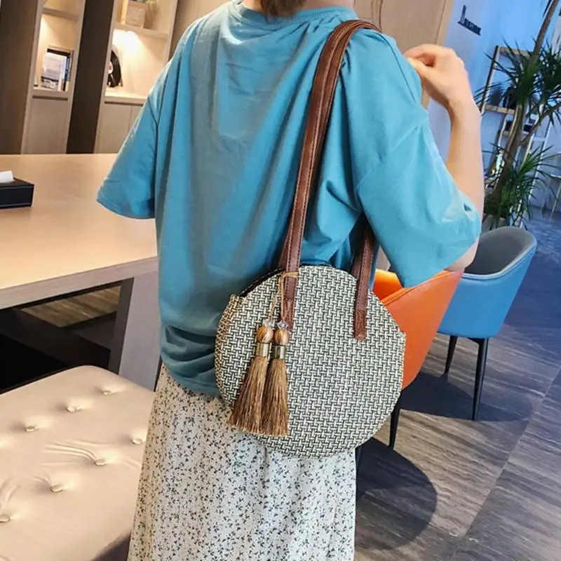 Модные женские сумки на плечо с бахромой, летние пляжные женские сумки с большой емкостью, повседневные соломенные тканые круглые сумки