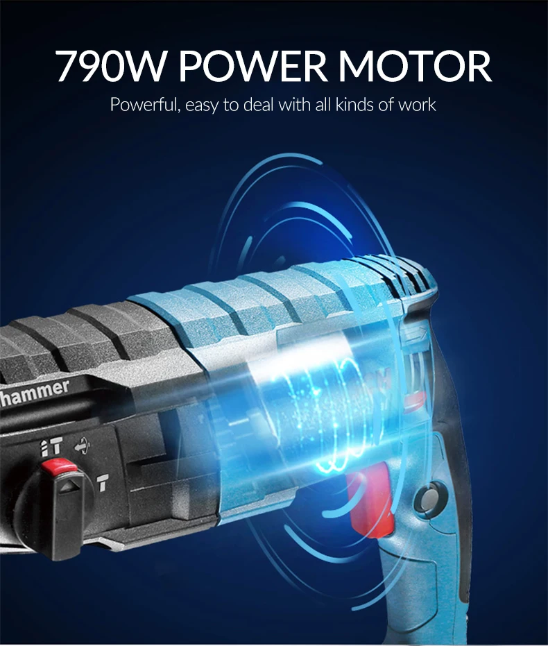 1. 3 режима работы Плоская дрель, молотковая дрель, кожух 2. Оптимизируйте коробку передач Эффективная передача 3. Снижение затрат на техническое обслуживание Высокая ликвидность на рынке некоторых частей 4. Утолщает ребра ракушки Прочная механическая структура 5. Вращающийся держатель для угольной щетки Одинаковая прямая и обратная скорость 6. Мягкая резиновая рукоятка Удобно держать Двигатель 7,790 ватт Подходит для интенсивной работы