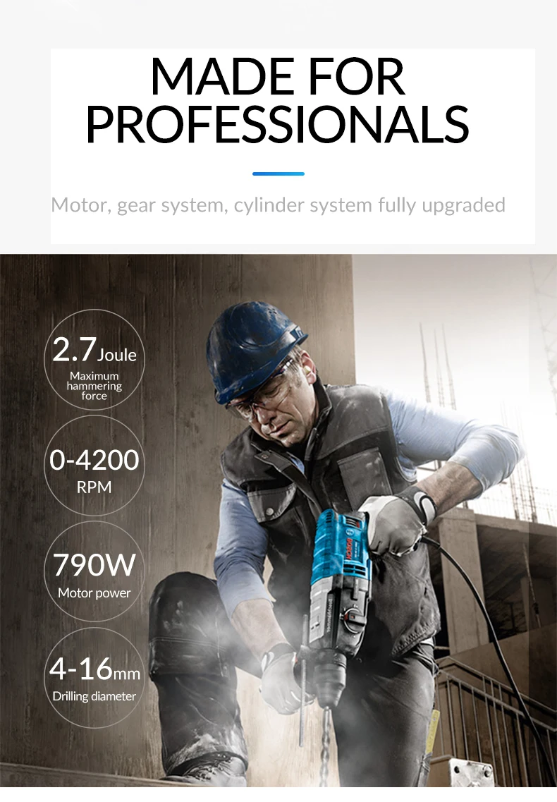 Рожденный Для профессиональных областей Коробка передач и цилиндрическая система полностью оптимизированы, а бурение шире, что легко справляется с большими диаметрами 2,7 Joules Одиночное максимальное усилие молотка 0-4200 коэффициент молотка (ПМ/мин)