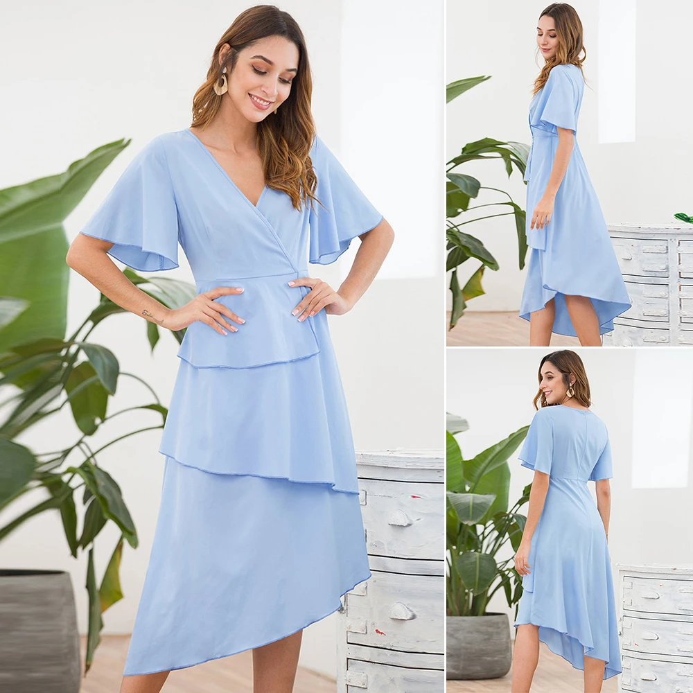 * Описание товара: женское летнее элегантное платье с v-образным вырезом и рукавами-колокольчиками и асимметричным подолом светло-голубого цвета