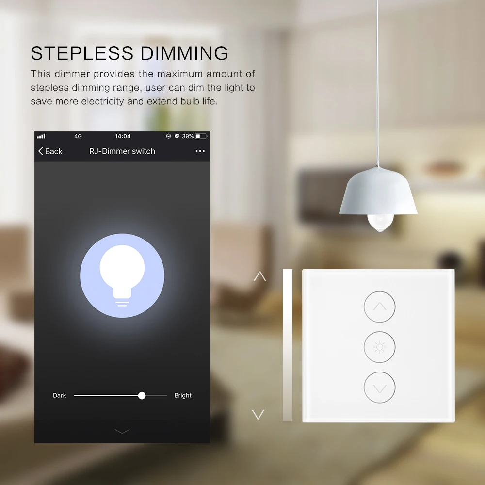 Используйте r можно использовать смартфон для удаленного включения/выключения света или регулировки Бесступенчатое Яркость в любое время и в любом месте с помощью приложения до тех пор, пока телефон iOS/Android имеет сеть 3G/4G/WIFI, что делает ваш домашний свет умным в 1 секунду. Приложение: приложение Smart Life