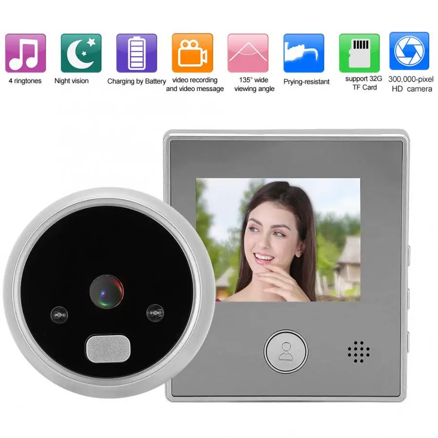 2,8 дюйма супер яркий на тонкопленочных транзисторах на тонкоплёночных транзисторах ЖК-дисплей дисплей для четкого и гладкий дисплей изображений или видео. 300000 пикселей высокой четкости камеры для захвата изображения высокой четкости и записи видео, захвата и записи информации посетителей своевременно и ясно. Широкоугольный объектив 135 ° обеспечивает большой обзор и безопасность дома. 24-часовой мониторинг безопасности для того, чтобы защитить вас и вашу семью круглосуточно. Инфракрасное Ночное Видение: изображение четко отображается днем и ночью, а снаружи все еще четко видно в темноте. Простота установки и эксплуатации, отсутствие специальных инструментов, экономия времени, усилий и денег.