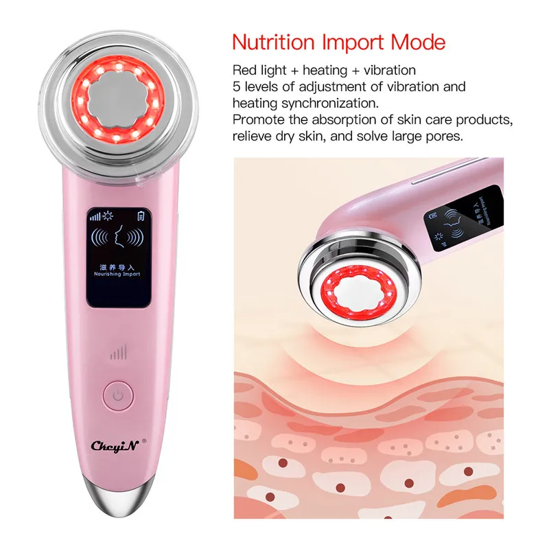 Режим 2: введение питания, функция: красный свет + нагрев + вибрация, 5 уровней регулировки вибрации и синхронизации нагрева. Способствует поглощению средств по уходу за кожей, снимает сухость кожи и устраняет большие поры.