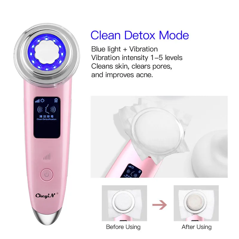Режим 1: очищение и детоксикация, функция: синий свет + вибрация, интенсивность вибрации 1-5 уровней. Очищает кожу, очищает поры и улучшает акне.