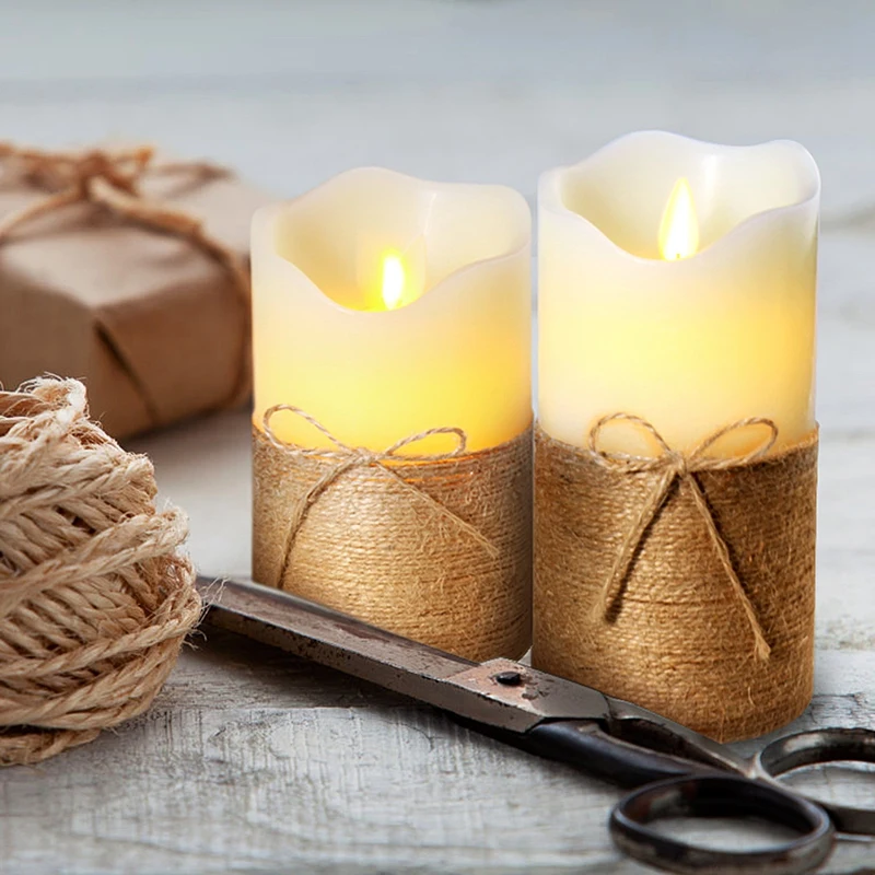 На батарейках мерцающие беспламенные Свечи имеют пеньковую веревку с галстуком-бабочкой, чтобы пламя выглядело ярче. Уникальный внешний вид с пеньковой веревкой, делает его лучшим украшением. Пеньковая веревка завязывается вручную.