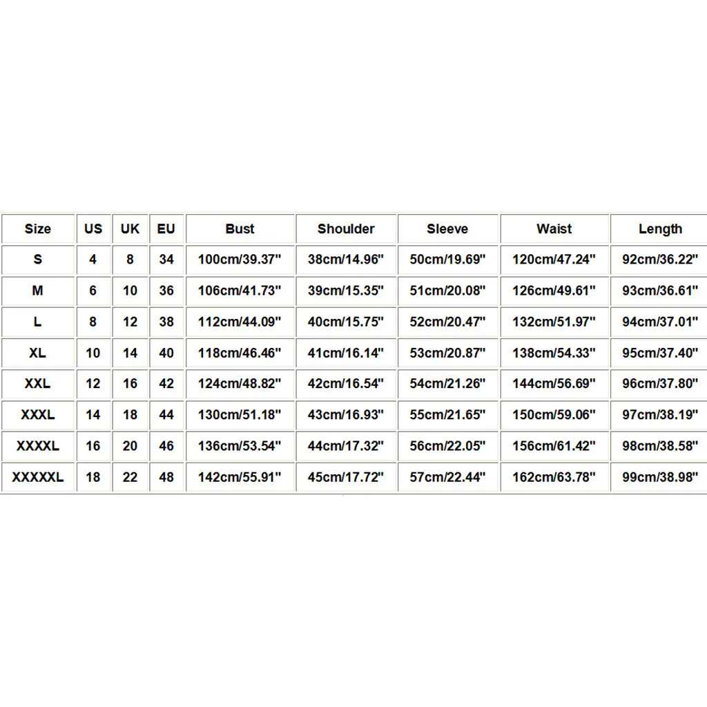 Размер: S США: 4 Великобритания: 8 ЕС: 34 Обхват груди: 100 см/39,37 дюйма Ширина плеч: 38 см/14,96 дюйма Рукав: 50 см/19,69 дюйма Талия: 120 см/47,24 дюйма Длина: 92 см/36,22 дюйма Размер: M США: 6 Великобритания: 10 ЕС: 36 Обхват груди: 106 см/41,73 дюйма Плечо: 39 см/15,35 дюйма Рукав: 51 см/20,08 дюйма Талия: 126 см/49,61 дюйма Длина: 93 см/36,61'' Размер: L США: 8 Великобритания: 12 ЕС: 38 Обхват груди: 112 см/44,09 дюйма Плечо: 40 см/15,75 дюйма Рукав: 52 см/20,47 дюйма Талия: 132 см/51,97 дюйма Длина: 94 см/37,01'' Размер: XL США: 10 Великобритания: 14 ЕС: 40 Обхват груди: 118 см/46,46 дюйма Ширина плеч: 41 см/16,14 дюйма Рукав: 53 см/20,87 дюйма Талия: 138 см/54,33 дюйма Длина: 95 см/37,40'' Размер: XXL США: 12 Великобритания: 16 ЕС: 42 Обхват груди: 124 см/48,82 дюйма Ширина плеч: 42 см/16,54 дюйма Рукав: 54 см/21,26 дюйма Талия: 144 см/56,69 дюйма Длина: 96 см/37,80'' Размер: XXXL США: 14 Великобритания: 18 ЕС: 44 Обхват груди: 130 см/51,18 дюйма Ширина плеч: 43 см/16,93 дюйма Рукав: 55 см/21,65 дюйма Талия: 150 см/59,06 дюйма Длина: 97 см/38,19 дюйма Размер: XXXXL США: 16 Великобритания: 20 ЕС: 46 Обхват груди: 136 см/53,54 дюйма Плечо: 44 см/17,32 дюйма Рукав: 56 см/22,05 дюйма Талия: 156 см/61,42 дюйма Длина: 98 см/38,58'' Размер: XXXXXL США: 18 Великобритания: 22 ЕС: 48 Обхват груди: 142 см/55,91 дюйма Плечо: 45 см/17,72'' Рукав: 57 см/22,44 дюйма Талия: 162 см/63,78 дюйма Длина: 99 см/38,98''