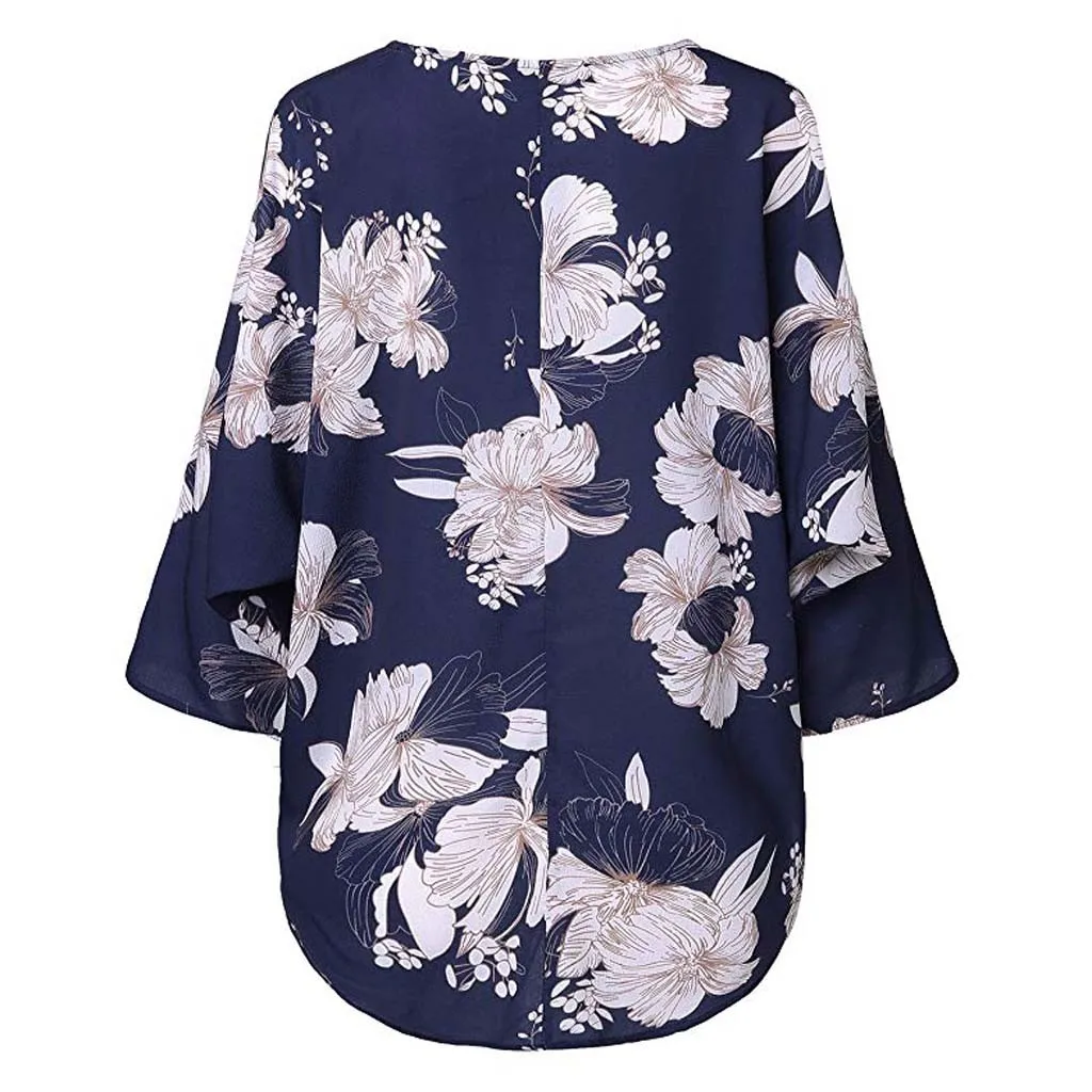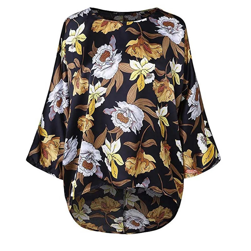 Женская мода o-образным вырезом печати летучая мышь рукав спереди длинный короткий топ с коротким рукавом