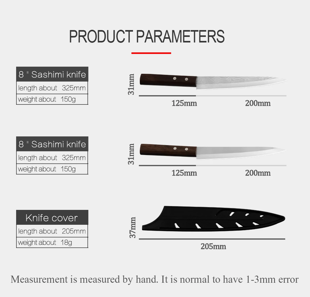 Характеристики: Твердость: 60-62 HRC Ремесло:Бесшовная сварка Материал лезвия ножа: Высокое качество 4CR14 нержавеющая сталь Особенности: Этот нож sashimi производится профессиональными работниками с богатым промышленным опытом, принятым интегрированным дизайном.Использование высококачественных материалов производства, прочный, соответствует эргономичному дизайну, не ржавеет, хорошее качество, легко режется, более длительный срок службы. В комплект входит: 1*8 дюймов сашими нож Напоминание: Держите его подальше от детей. Избегайте тепла или ударов. Не используйте свою руку для проверки твердости лезвия.