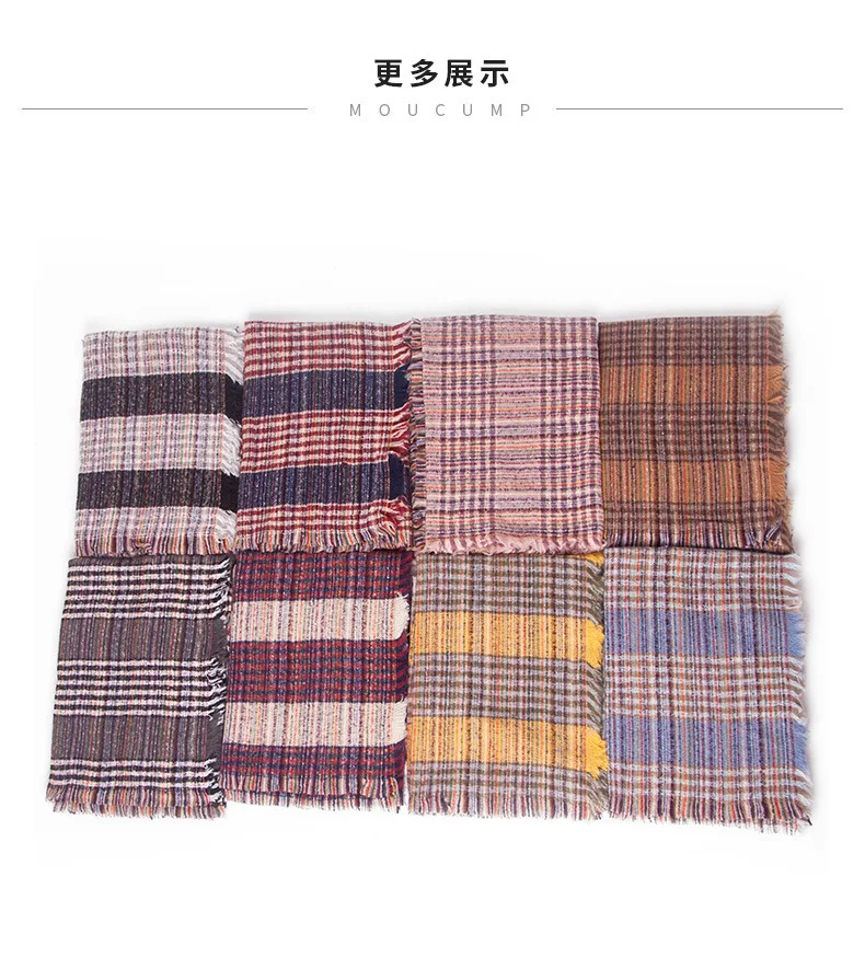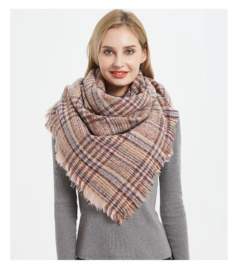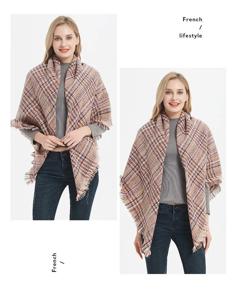 Двухцветный клетчатый шарф имеет квадратную форму и большой размер, как одеяло. ~