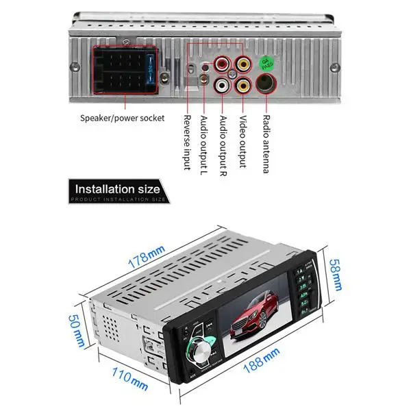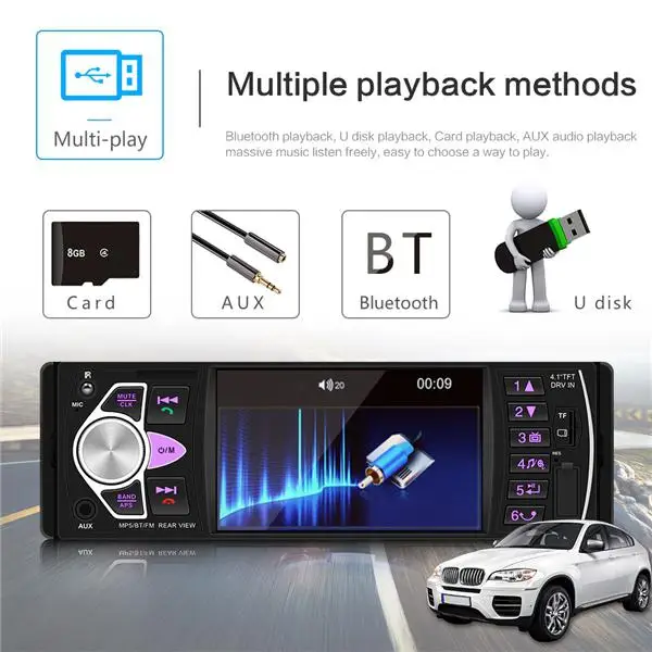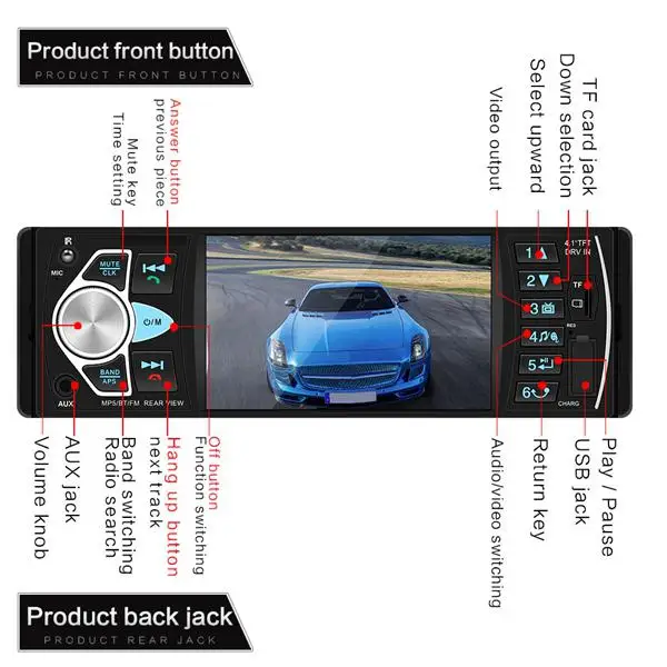 Support Bluetooth audio music and hands-free calls,radio function and built-in Aux Input,rear view camera input function,TF card(up to 32GB) slot and standard USB interface Supported languages: English Russian French Portuguese,Italian Spanish German 24 hours digital display clock and date,can charge for mobilephone or other USB devices. Your perfect choice for your favorite car.