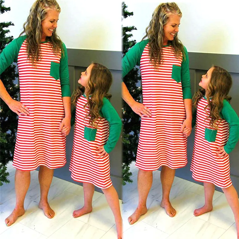 Рождественская одежда в полоску для семьи Одинаковая одежда для мамы и дочки платья с длинными рукавами и круглым вырезом Свободное платье для родителей и ребенка
