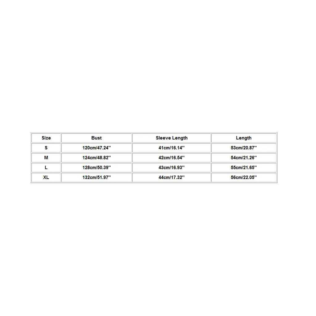 Размер Обхват груди Рукав Длина Длина S 120 см/47,24'' 41 см/16,14'' 53 см/20,87'' М 124 см/48,82'' 42 см/16,54'' 54 см/21,26'' L 128 см/50,39'' 43 см для ухода за ребенком для мам/16,93'' 55 см/21,65'' XL 132 см/51,97'' 44 см/17,32'' 56 см/22,05''