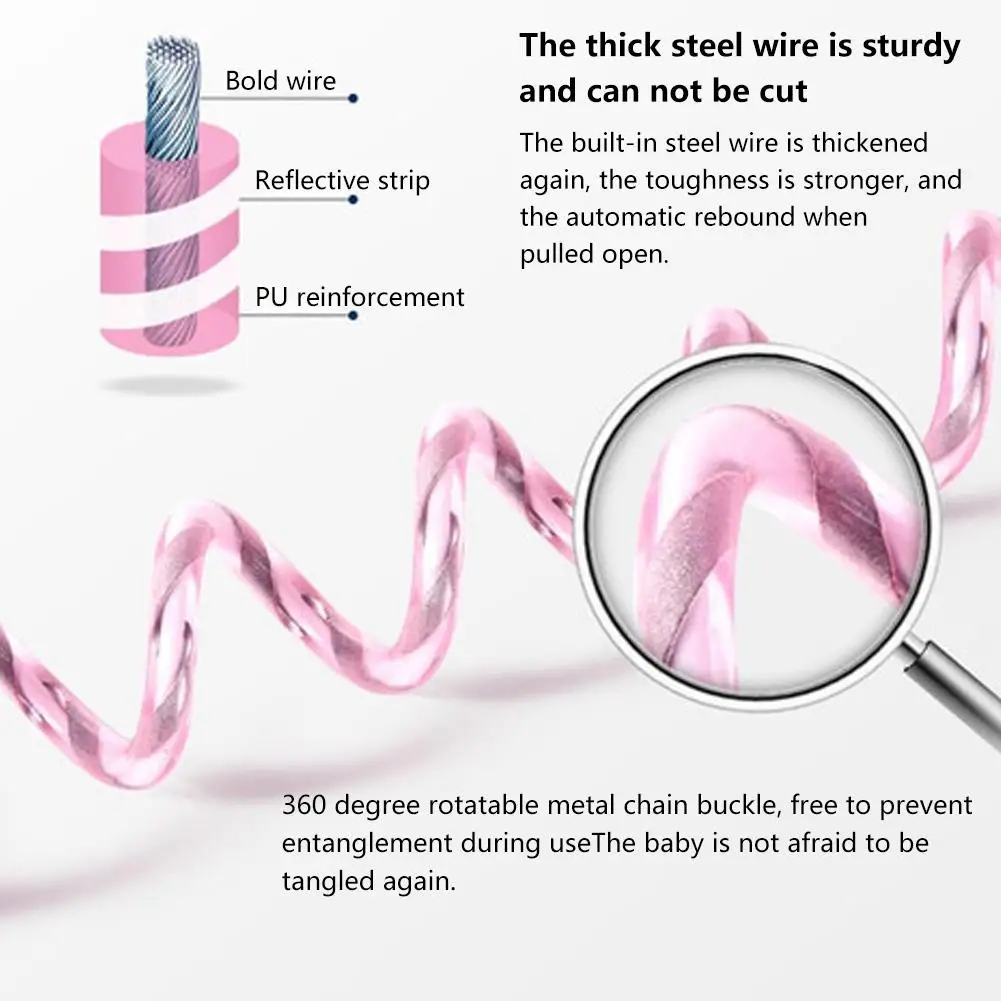 2. Цепь для запястья с защитой от потери изготовлена из выдвижной стальной проволоки, которая упакована в пластик и может быть легко повреждена. Этот детский ремень соединен поворотным соединителем на 360 градусов, чтобы предоставить вам больше возможностей для деятельности Вашего ребенка.