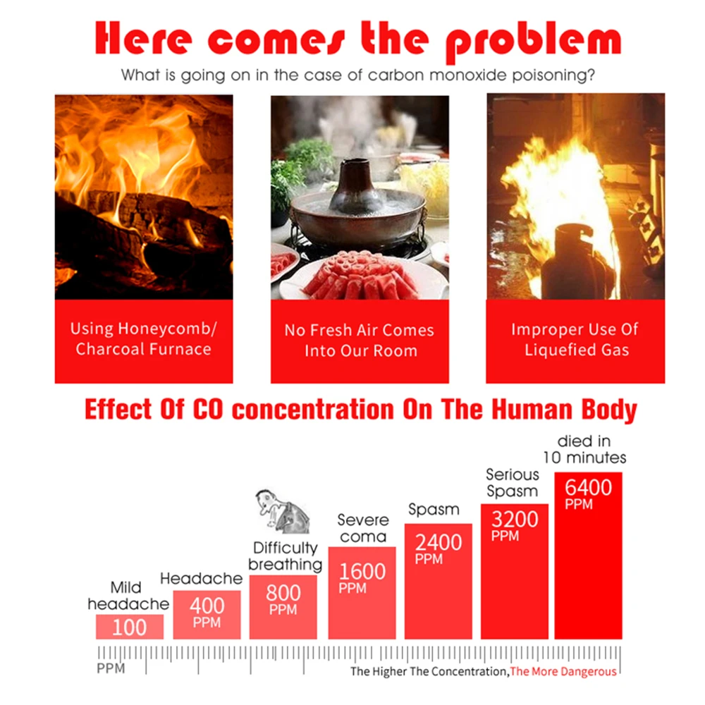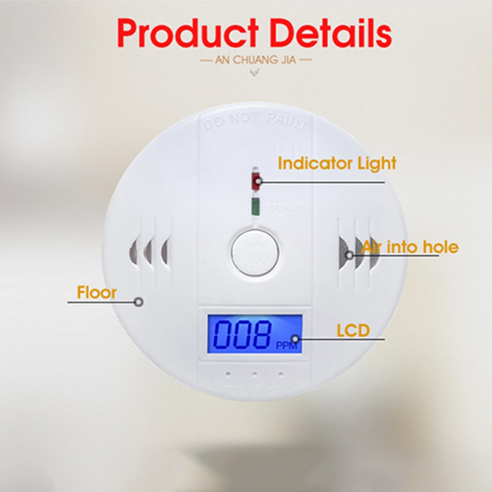 -Функция энергосбережения: звуковой сигнал тревоги составляет 4 звуковых сигнала каждые 5 секунд в течение первых 4 минут. В течение 4 минут, он будет меняться на 4 звуковых сигнала каждую минуту, чтобы сохранить батарею.