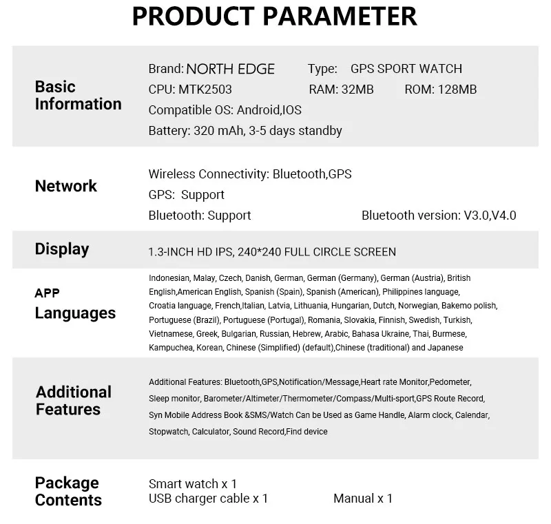 1. GPS/GPS запись о маршруте 2. Пульсометр/монитор сна 3. Высотомер, барометр, компас 4. Шагомер, секундомер, таймер, калории 5. Мульти-Спорт: Туризм/Велоспорт/марафон 6. Будильник 7. Календарь 8. Калькулятор 9. Запись звука 10. Найдите устройство 11. Вызов ума, сообщение ума, ответ на вызов