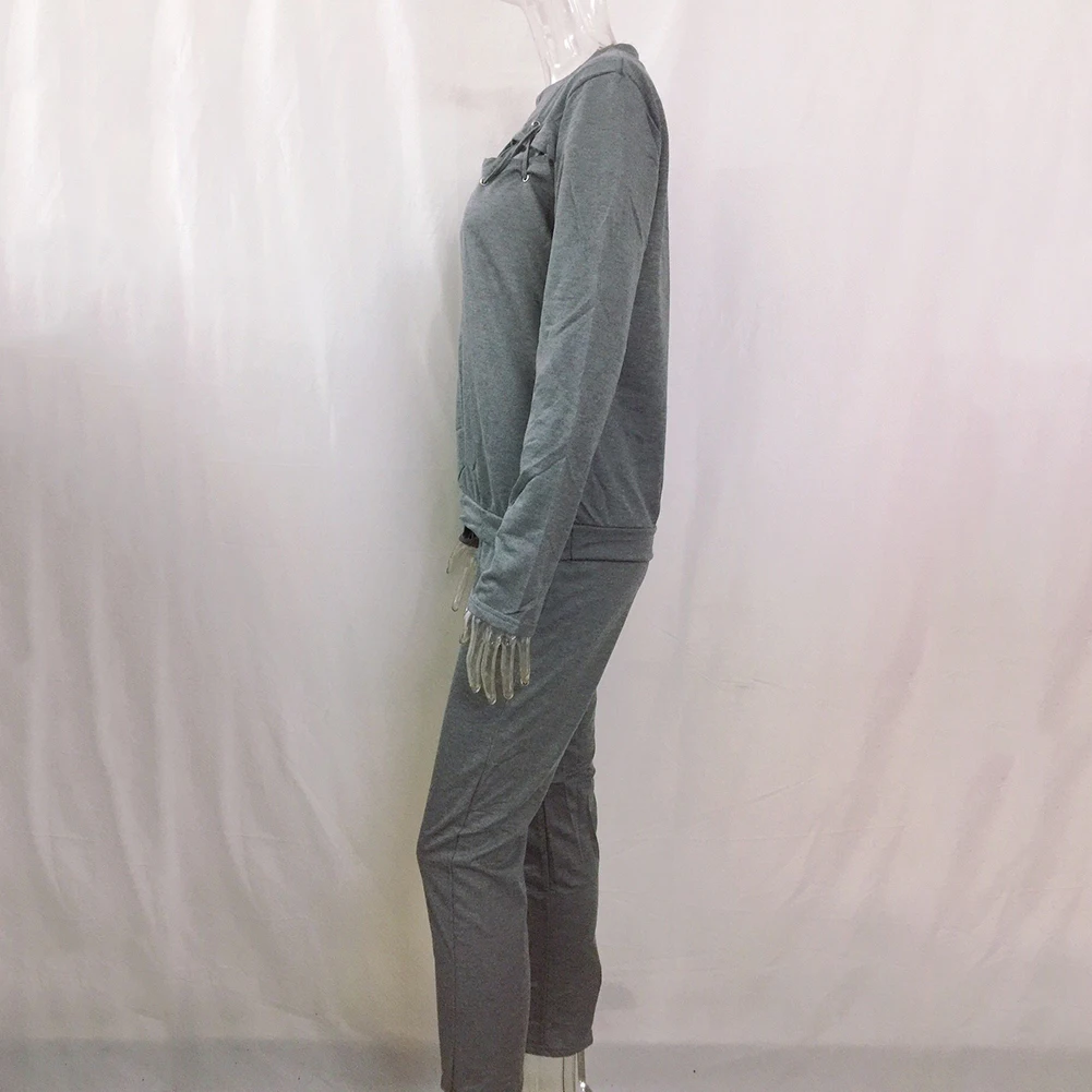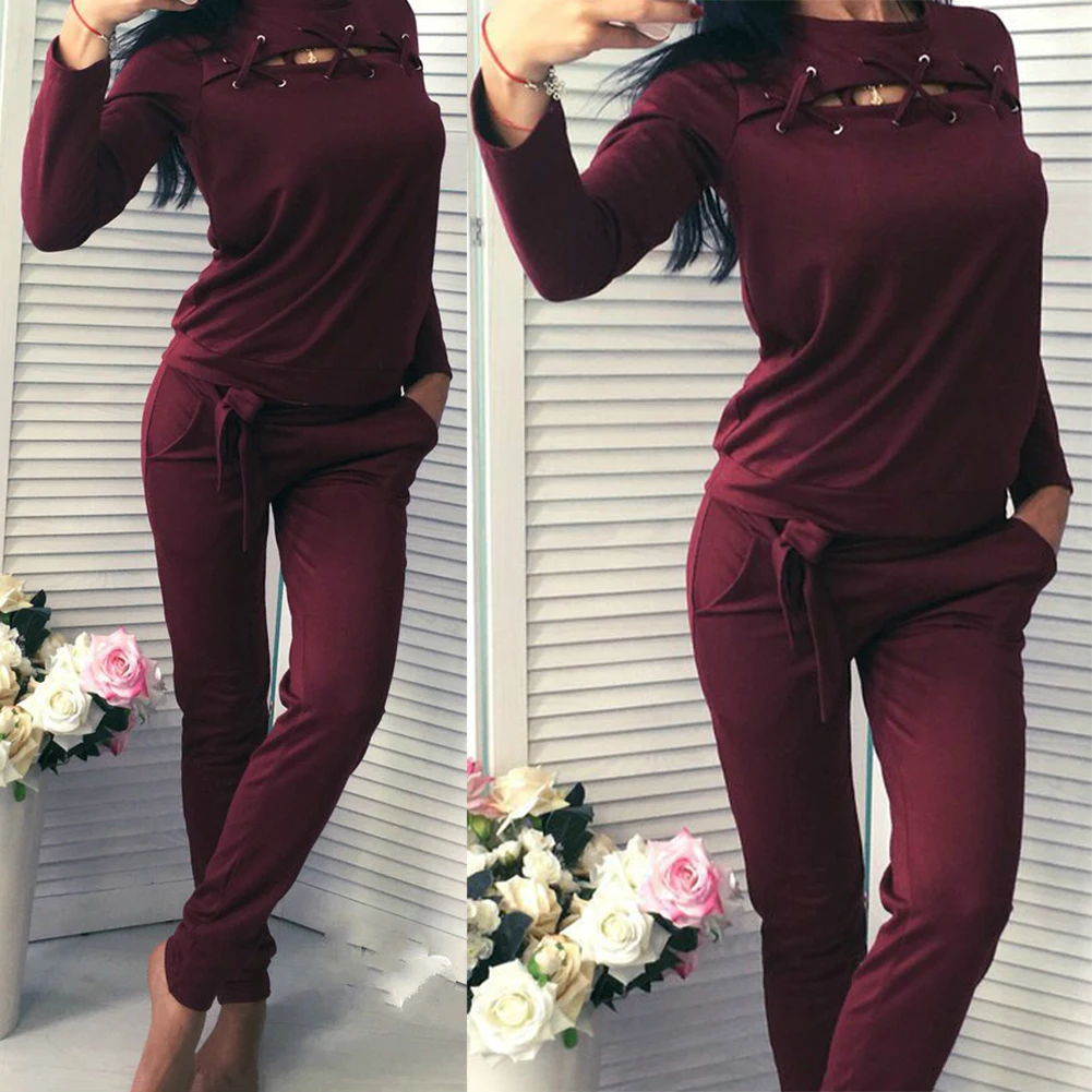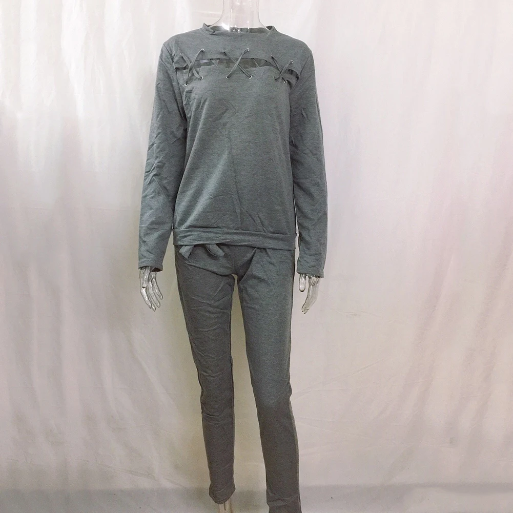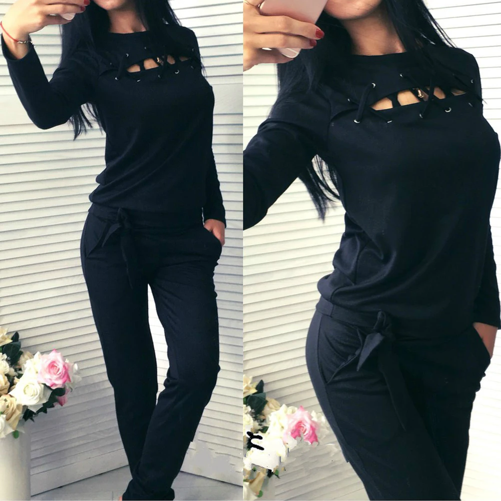 Женский спортивный костюм из 2 предметов с вырезами, свитер со шнуровкой, штаны, однотонный спортивный костюм