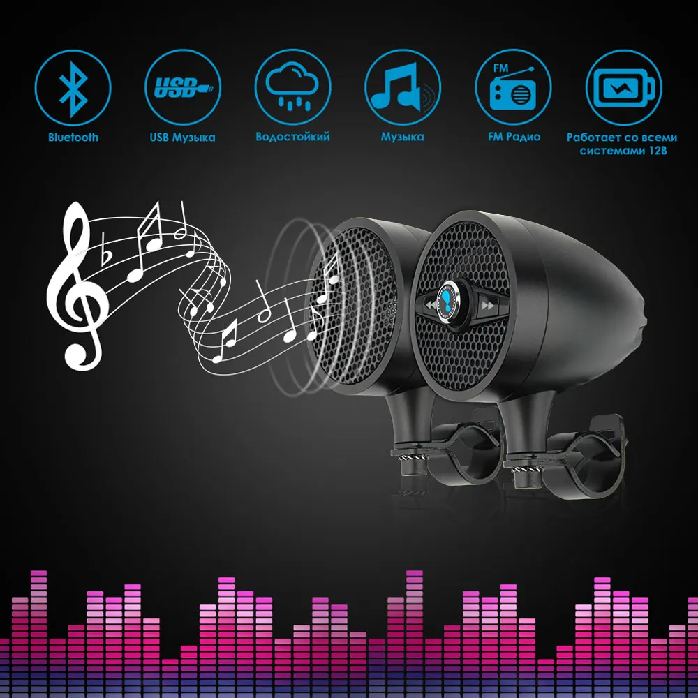 Подключи и играй стереозвук для своего крейсера или квадроцикла! Подключите провода питания к аккумулятору, подключите конлонки к жгуту проводов, подключите необходимые аксессуары, установите динамики на ручки, защитные кожухи двигателя или другой элемент рамы, включите питание, выполните сопряжение с мобильным телефоном через Bluetooth и сразу сможете наслаждаться музыкой во время круиза!