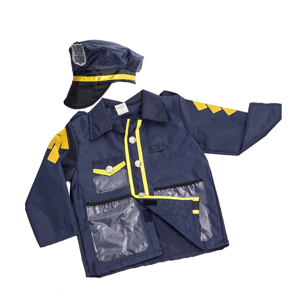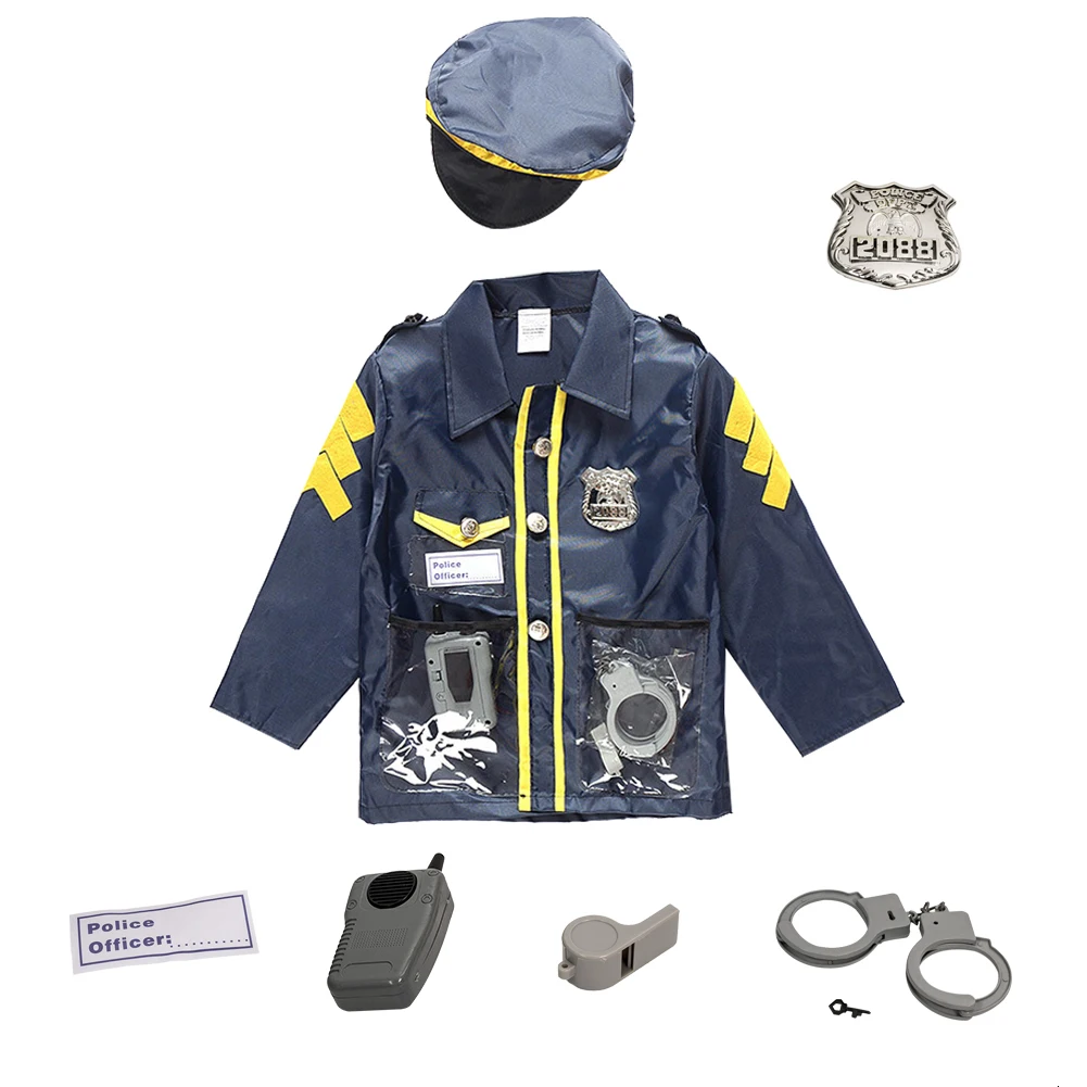 В комплект входит шляпа полицейского с эластичной спинкой, медаль, рация, наручники, свисток, свисток и ярлык с именем, которые могут быть настроены; сборка подойдет для возраста 4-8 лет.