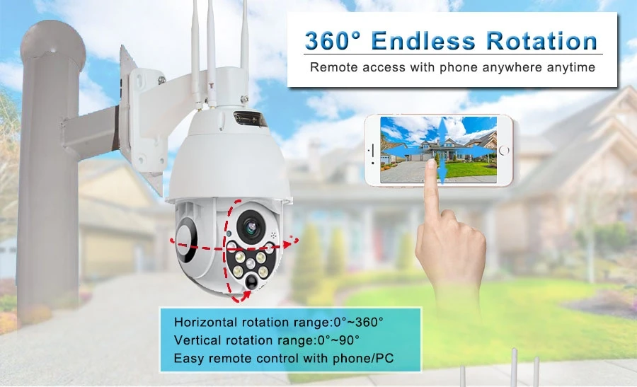 Built in AI algorithm to capture targets(Human) accurately and quickly. Auto focal-length adjustment algorithm to capture clearer image once target detected and locked, closely follow the target for every movement. Support watch position tracking. Camera stayds by at key position and goes back to watch position after each tracking, Support cruise tracking. Camera stops cruise scan and zooms in to capture the targer once targer detected, after tracking camera continues cruise scan. Support remote reading and managing video files on SD card with phone APP iCute CAM. High speed dome, precision motor drive, responsive, smooth operation, accuracy deviation less than 0.1 degrees, no jitter at any speed. Anti-surge and lightning protection devices to effectively prevent 4000V instantaneous current. Up to 350m clear vision for day and at least 200m clear vision at night. HD 2 megapixels, real 20X optical zoom. iCute CAM for phone APP H.2654/H.265 With audio in&out port. Two-way audio function if with microphone and speaker connected. (Microphone or speaker not included)