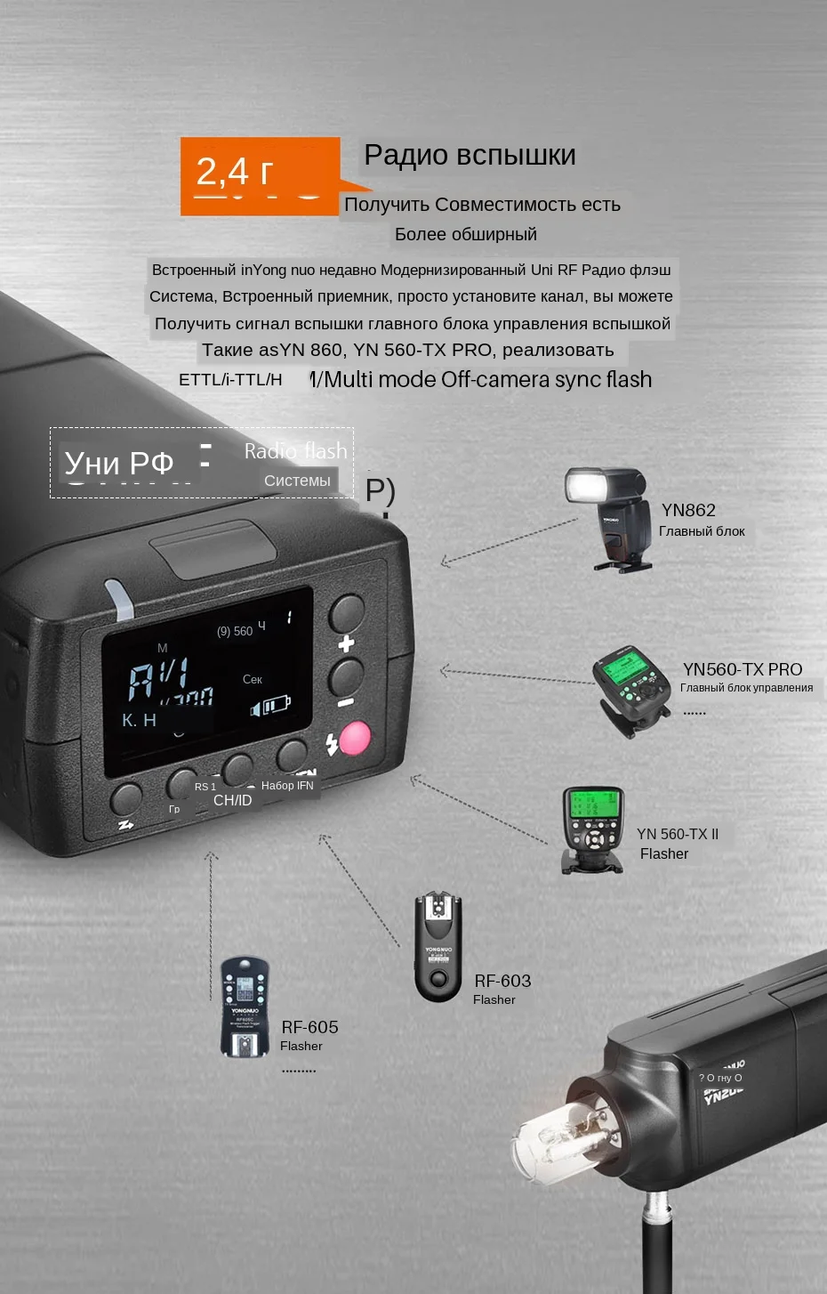Бренд: Светодиодная лампа для видеосъемки YONGNUO ------------------------ Модель: YN200 Мощность вспышки: 200 Вт Направляющий номер: 60 при ISO100 (с помощью отражателя) Цветовая температура 5600 K Источник питания: 14,4 В 2900 мАч литиевая батарея Время переработки: около 0,01-2 С Регулировка мощности: 1/1 ~ 1/64 Вспышка полной мощности: около 500 раз Режим триггера: режим радио slave (YN560), режим оптической передачи (SC/SN), S1, S2, триггер Синхронного Интерфейса Режим вспышки: ttl, M, Multi Синхронизация: 3,5 мм Интерфейс обновления: Micro-USB Размер изделия: около 20,5*7,8*5,3 см/8,1*3,1*2,1 дюйма (без вспышки) Вес изделия: 540 г/19 унций (без аккумулятора и вспышки) ----------------------------- Модель: YN560-TX PRO Система контроля экспозиции: E-TTL II/E-TTL Autoflash, ручная вспышка, мульти вспышка, Gr flash Беспроводной канал: 1-16 Управление ведомым блоком: до 5 групп (A/B/C/D/E) Расстояние: прибл. 100 метров Управление коэффициентом вспышки: 1:8-1:1-8:1, 1/2-стоп FEC: 1/3-с шагом стопа ± 3 стопа Высокоскоростная синхронизация: Поддержка Ручная вспышка: мощность 1/1-1/128 (с шагом 1/3 стоп) Стробоскопическая вспышка: поддержка (1-500 Гц) Вспомогательный пучковый излучатель и обновление прошивки: Поддержка Источник питания: 2 * батарейки АА (не входят в комплект)