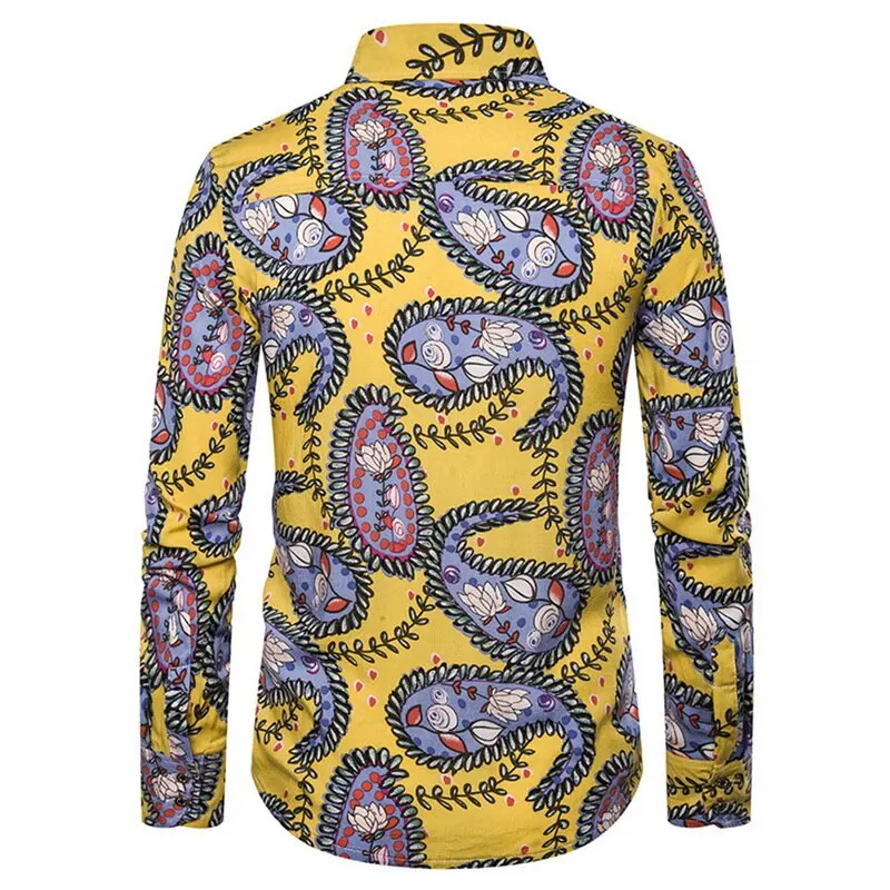 Мужская повседневная льняная рубашка на пуговицах с принтом и длинным рукавом, приталенная рубашка с цветочным принтом