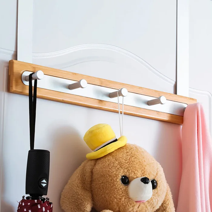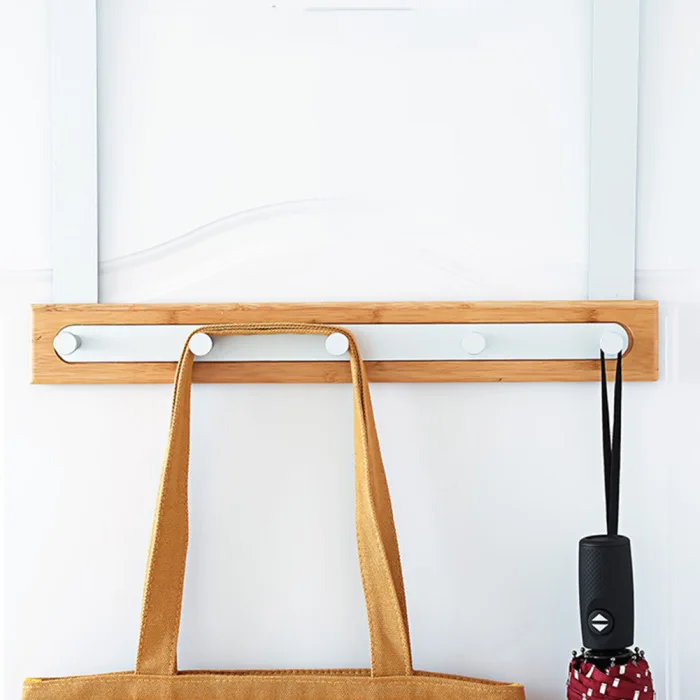 Stay organized with this modern, wooden bamboo over-the-door organizer rack with hooks; it's the perfect addition to your bathroom and a great place to hang towels, bathrobes, and pajamas