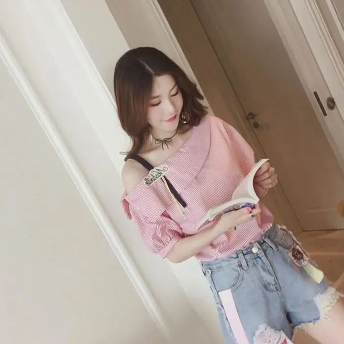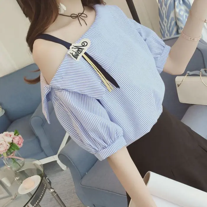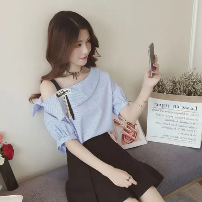 Тип одежды: 1 шт.; женская летняя футболка в полоску с открытыми плечами и короткими рукавами; пуловер на бретелях; женские топы