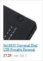 Характеристики: 1. Абсолютно новый, высокое качество 2. Поддержка замены 18650 Li-battery. Простота в использовании и безопасность 3. Можно установить аккумулятор 18650 5X (аккумулятор не входит в комплект) 4. Может также использоваться в качестве зарядного устройства для аккумуляторов 18650 5. Функция: внешний аккумулятор и перезаряжаемое зарядное устройство 18650 6. Подключи и работай, выходная мощность с помощью usb-порта, подключите кабель передачи данных для достижения портативности, Готов к зарядке 7. Совместим с: iPhone6 plus/6/5S,Samsung Galaxy S2/S3/S4, Note 2/3/4, HTC, Sony, motorola и другие мобильные телефоны с разъемом micro usb (можно заряжать все сотовые телефоны с помощью собственного usb-кабеля)