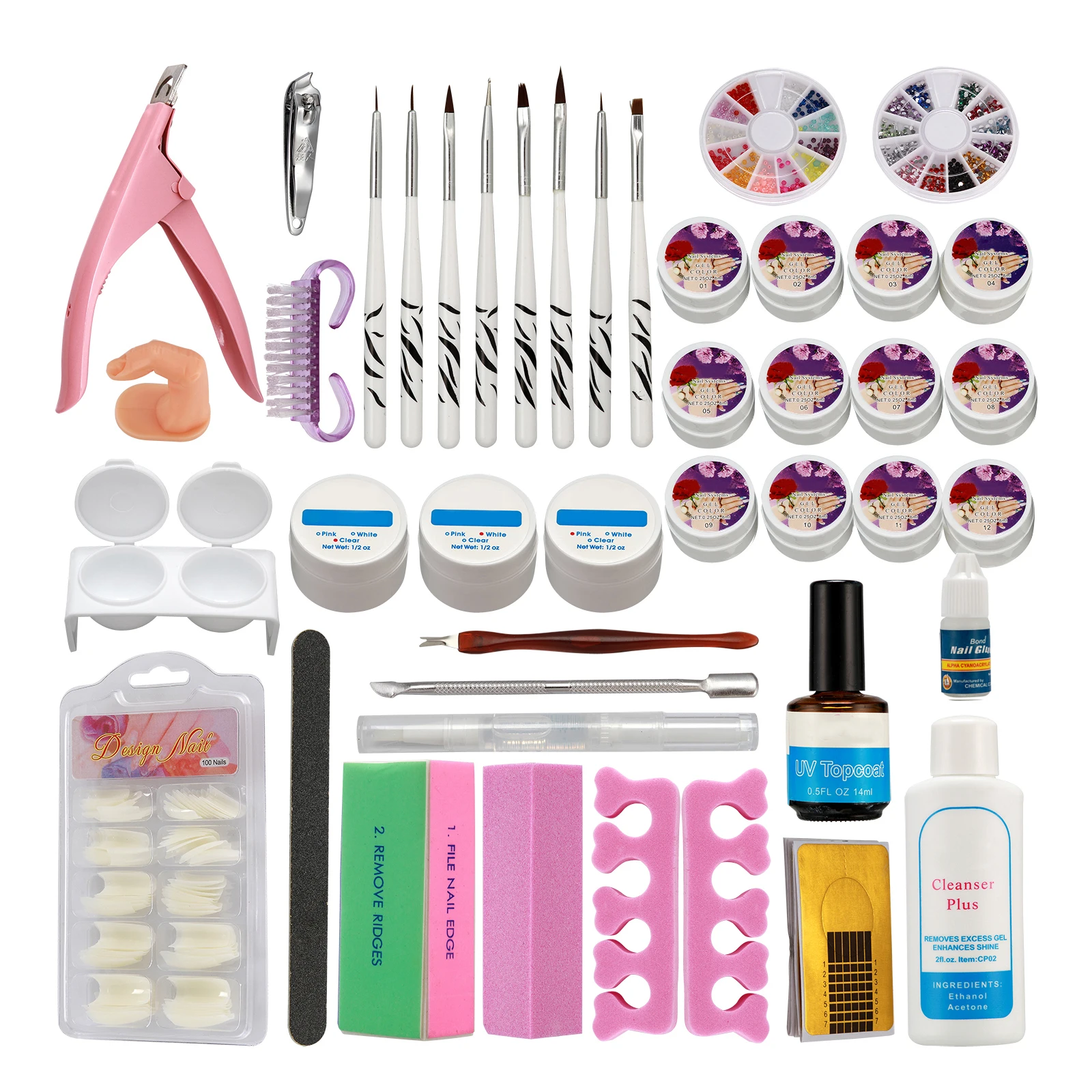 100% абсолютно новый в розничной упаковке Создание долговечной и блестящей отделки Подходит для начинающих или профессионального использования Мы также продаем УФ-лампы и украшения для дизайна ногтей. Добро пожаловать в наш магазин. Посылка: 1 x Масло для кутикулы (случайный вкус) 1 x резак 1 x моющее средство plus 1 УФ гель для ногтей (розовый) 1/2 унции 1 х УФ гель для ногтей (белый) 1/2 унции 1 x УФ гель для ногтей (прозрачный) 1/2 унции 8 x Кисть для рисования (случайный узор) 1 x вилка для кутикулы 1 х кутикулы толкатель двухсторонний 1x12 цветов Стразы 1x12 цветов жемчуга 2 x маникюрный сепаратор 1 x клей для ногтей 20 x Форма для ногтей 1 x 4Way песочный блок (случайный узор) 1 буферный блок (случайный узор) 1 х шлифовальный файл (случайный узор) 1x100 шт. кончики для ногтей-натуральные 1 х Боковая машинка для стрижки 1 х УФ верхнее пальто 1 х тренировочный палец 1 x щетка для очистки (случайный цвет) 1x12 цветов УФ-гель (случайный набор цветов) 1 х Dappen блюдо