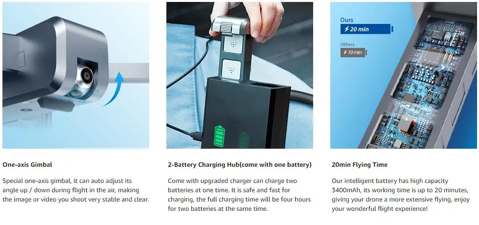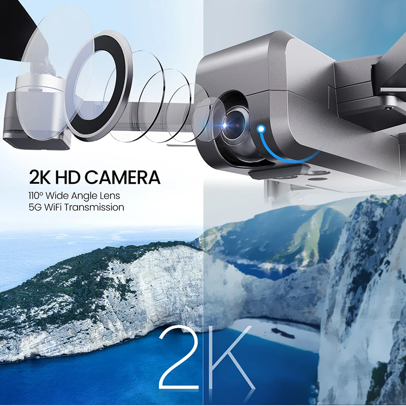 [2K Full HD 5G Wi-Fi камера]: 5G Высокоскоростная передача изображения Wi-Fi (1640ft-2624ft) без задержки, наслаждайтесь приложением в режиме реального времени; профессиональная камера 2K с широким углом обзора 110 ° может регулировать 90 °, записывая каждый прекрасный момент. Встроенный одноосевой карданный шарнир, который снижает вибрацию и делает съемку более стабильной. (для камеры 2K требуется sd-карта 16/32G)