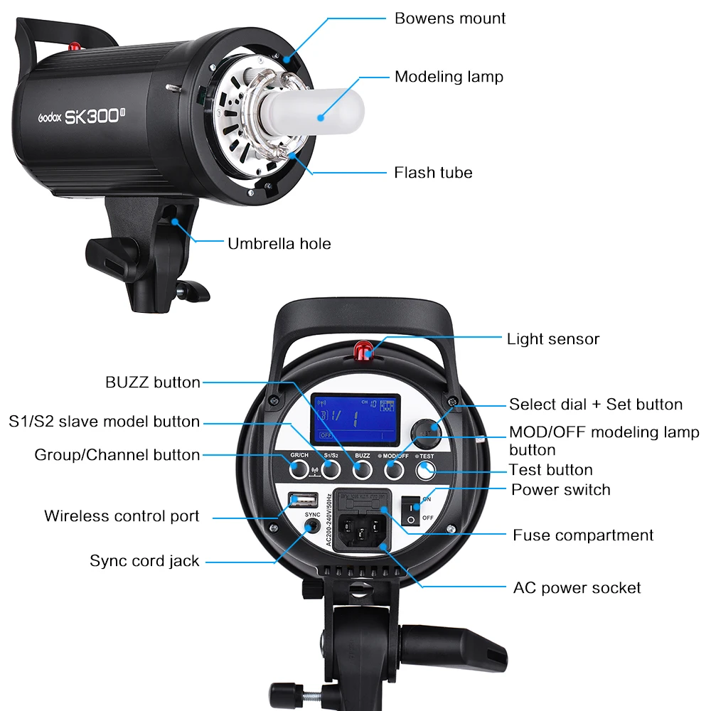 Студийная Вспышка Godox SK300II-это компактная и прочная вспышка с полными функциями. Со встроенной беспроводной системой Godox 2,4G X, это экономичный компактный флэш-стробоскоп для съёмки продукта электронной коммерции, студийного портрета и фотографии образа жизни. В небольшой и средней студийной съемке он может работать как высокий светильник, фоновый светильник или светильник для волос.