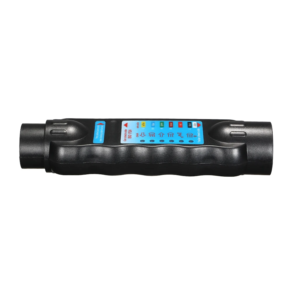 This tester has one side to connect the 7-pins plug of a trailer and another side to connect the 7-pins socket of a car.