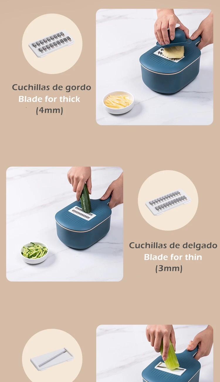 1. Изготовлен из нержавеющей стали и полипропилена высокого качества; 2. Se может нарезать все виды овощей, Натереть сыр, нарезать картофель и Нарезать Фрукты, вы можете даже создать овощи, склеенные или пюре; 3. Низкий Резак имеет свой собственный контейнер для воды для книг овощей или продуктов питания, никогда не пропустите их и можете мыть их непосредственно, вы можете помочь вам сэкономить 70% время и подготовить продукты более элегантной; Размер: 28,8*14*9 см Вес: 480 г Цвет: темно-синий, синий, серый, розовый