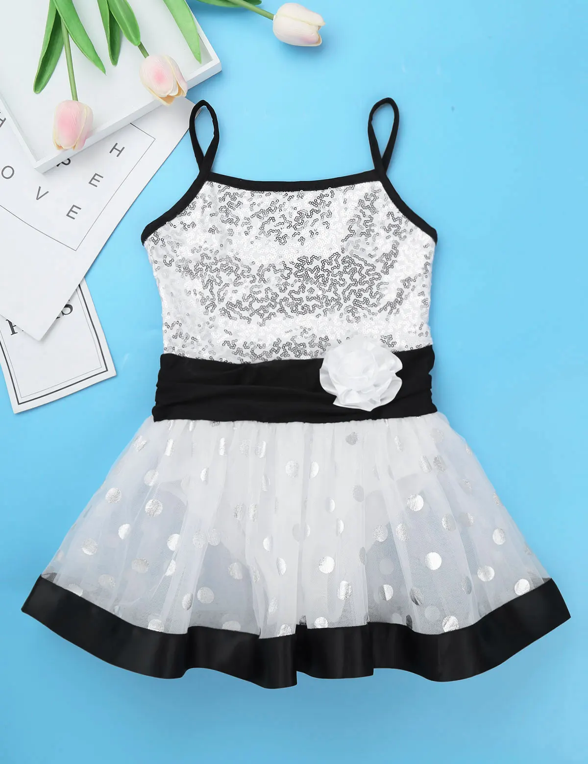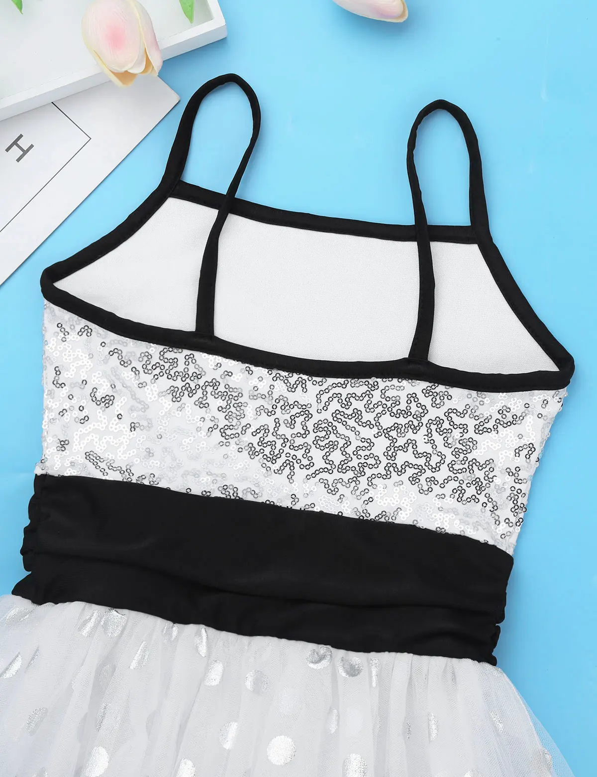 Балетное трико платье выполнено из полиэстера, пайеток и сетчатого материала, ручная стирка.