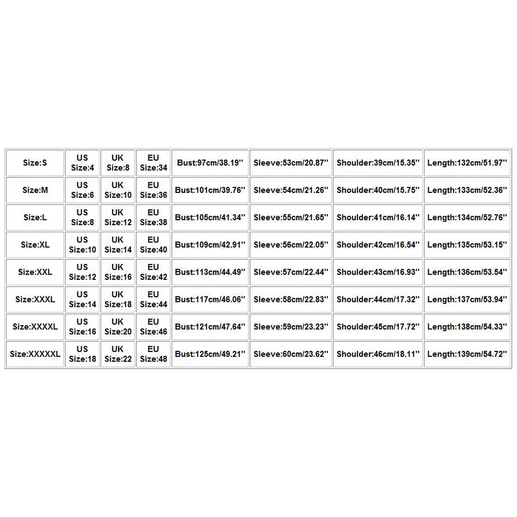 Пожалуйста, сравните размеры детали с вашими перед покупкой!Цвета могут немного отличаться в зависимости от настроек компьютера и монитораПожалуйста, учитывайте разницу в 1-3 см из-за ручного измерения, спасибо (все измерения в см и обратите внимание, что 1 см = 0,39 дюйма)Размеры таблицей:РазмерНам РазмерыUK РазмерыЕС РазмерыОбхват грудиРукаваСумка на плечоДлинаS483497 см/38,19''53 см/20,87''39 см/15,35''132 см/51,97''М61036101 см/39,76''54 см/21,26''40 см/15,75''133 см/52,36''L81238105 см/41,34''55 см/21,65''41 см/16,14''134 см/52,76''XL101440109 см/42,91''56 см/22,05''42 см/16,54''135 см/53,15''XXL121642113 см/44,49''57 см/22,44''43 см для ухода за ребенком для мам/16,93''136 см/53,54''XХХL141844117 см/46,06''58 см/22,83''44 см/17,32''137 см/53,94''XXXXL162046121 см/47,64''59 см/23,23''45 см/17,72''138 см/54,33''XXXXXL182248125 см/49,21''60 см/23,62''46 см/18,11''139 см/54,72''