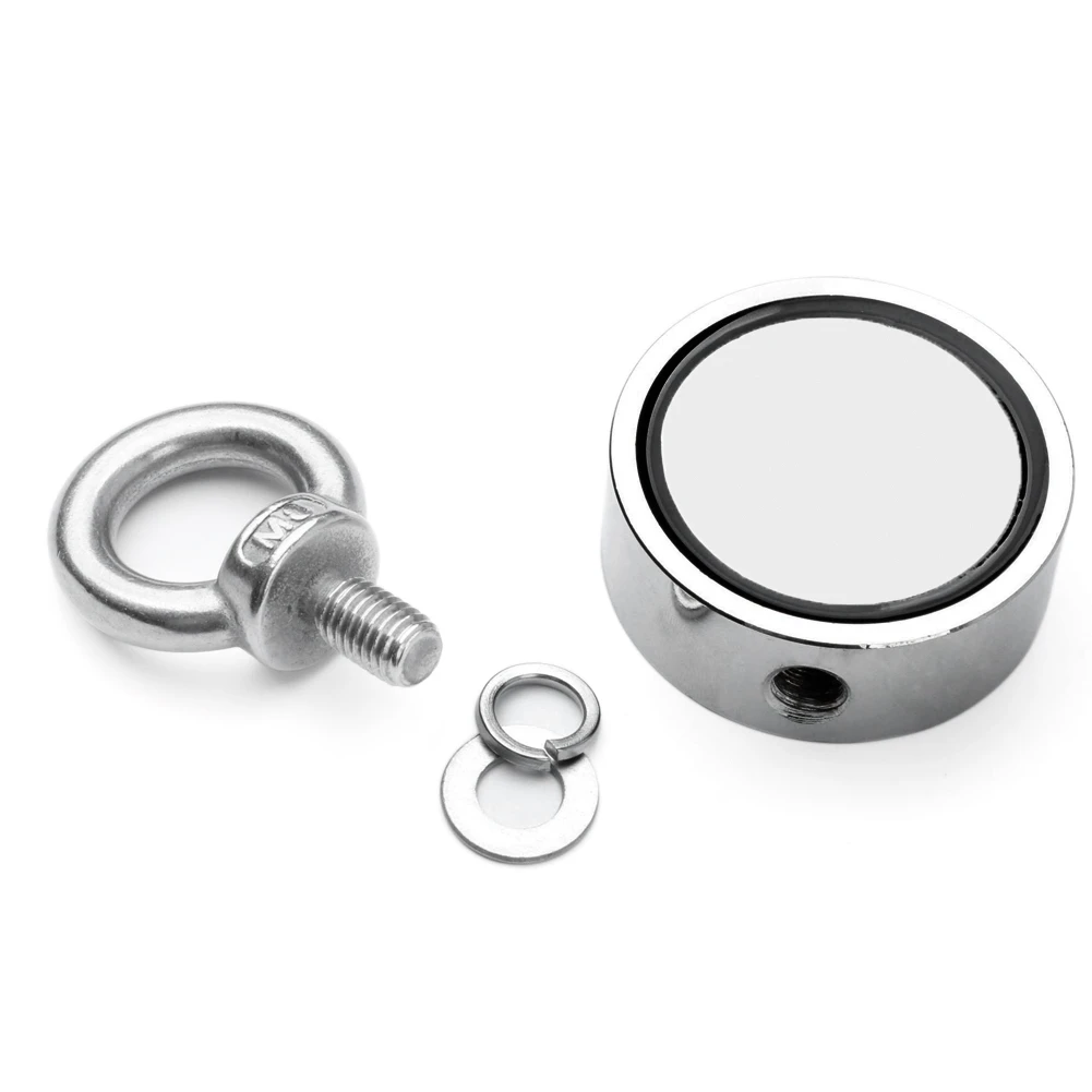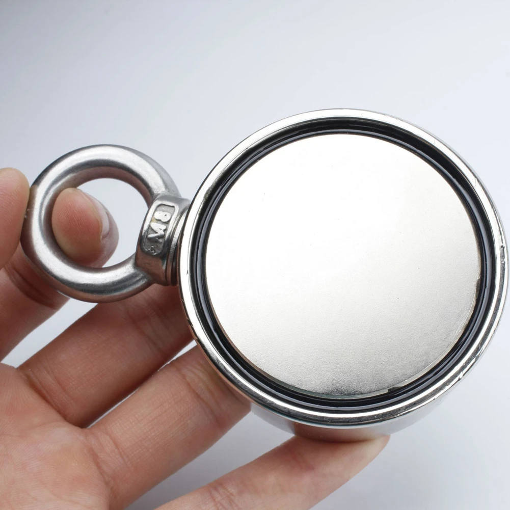 (Double Side Powerful Neodymium Magnet)- 60mm diameter and 30mm thickness ,Double sided pulling force will up to 661LBS(300KG) totally.extremely powerful magnetic pulling force for a direct Press and direct pull under perfect conditions.Specifically designed for magnet fishing,Salvage.One magnet provide twice the surface area to catch targets. (Top Quality): Ni+Cu+Ni Triple Layer Coated. The Best Coating Available, which Provides a Shiny and Rust Resistant Coated steel cup provides protection for the magnet and helps to prevent chipping or cracking.Force permanent, long service life. (MULTI USE)- powerful neodymium magnet is great for magnet fishing, lifting, hanging, retrieving applications. Have fun searching for lost treasure in rivers, lakes, wells, canals or ponds. It can also used to hold or fix for your warehouse garage or yard items like eye bolt, screws, hooks, fasteners, adsorption or anywhere you need an incredibly strong magnet. (Easy to Use)- Instead of a countersunk hole going through the magnet and having to find pieces to make a fishing magnet, it is easy assembled with eye bolt screws directly into steel base. Just attach a rope and begin your fishing treasure trip. Note: Strong magnets should Keep away from Ironware and some easily magnetized iron products, such as monitors, bank cards, computers, televisions, mobile phones and other Magnets might affect water meter ,electric meter, gas meter and some metering equipment exist some inaccurate affect (Such as : if magnets placed near the meter, the meter will slow down)Please keep away from children and something sensitive to magnetic fields! Don't stick it to any heavy metal! It may be hard to get it off! colour:Silver Material:magnet Package Contents: 1 * Magnet Only the above package content, other products are not included. Note: Light shooting and different displays may cause the color of the item in the picture a little different from the real thing. The measurement allowed error is 2-3mm error