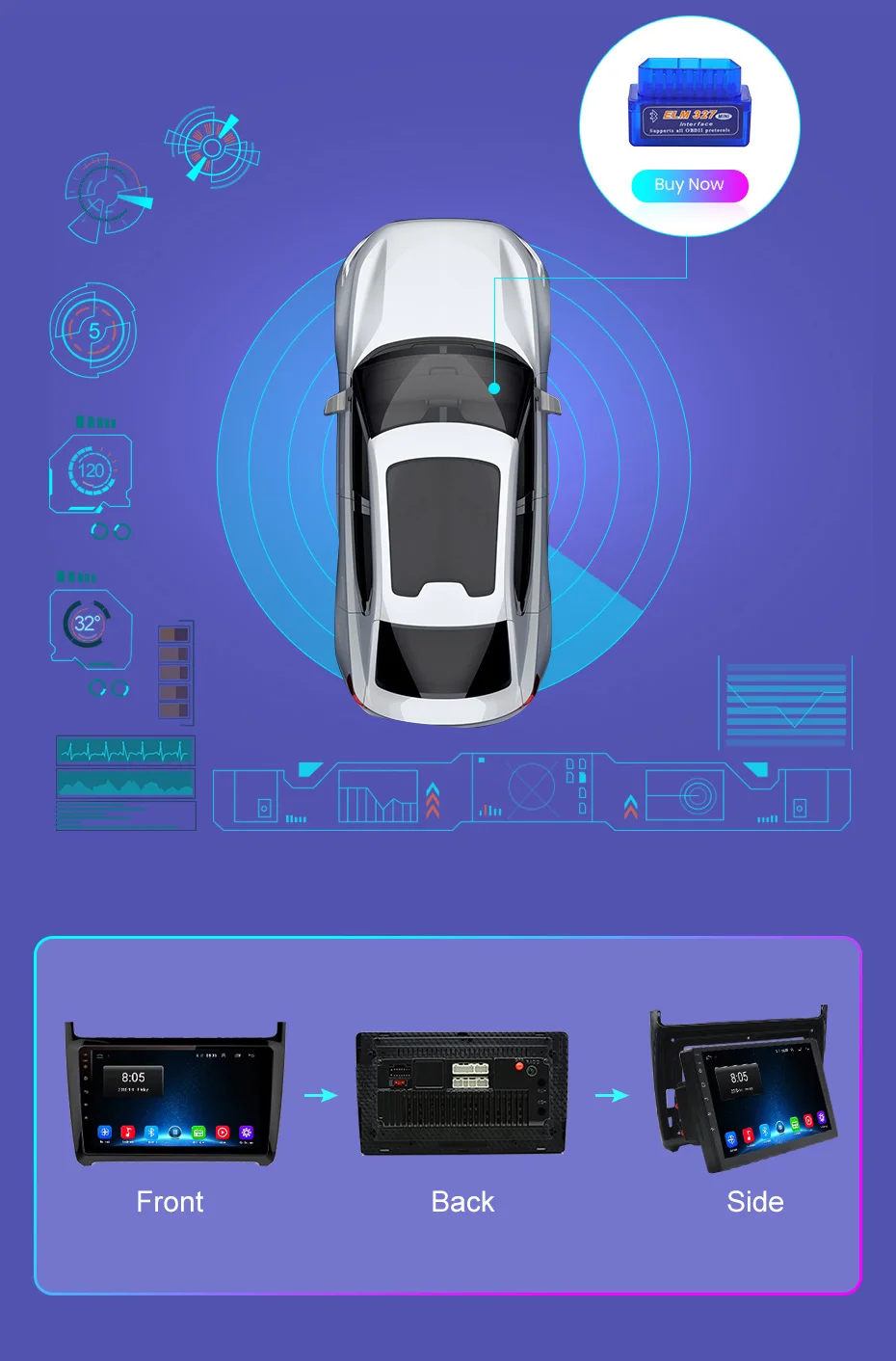 6.How to change the Boot Logo for WIFI version? Settings ---Car infotainment ---Common---Boot logo ---password 5678---you can choose the logo you want 7.How to make OBD2 work for WIFI version? Please enter the settings to remove the OBD2 icon to the desktop, and then connect normally. Settings--Car infotainment--About device---Click gear on the right(it ask for a code 8888)---Menu icon double click left icon ,it will show in the right box ,then save it .
