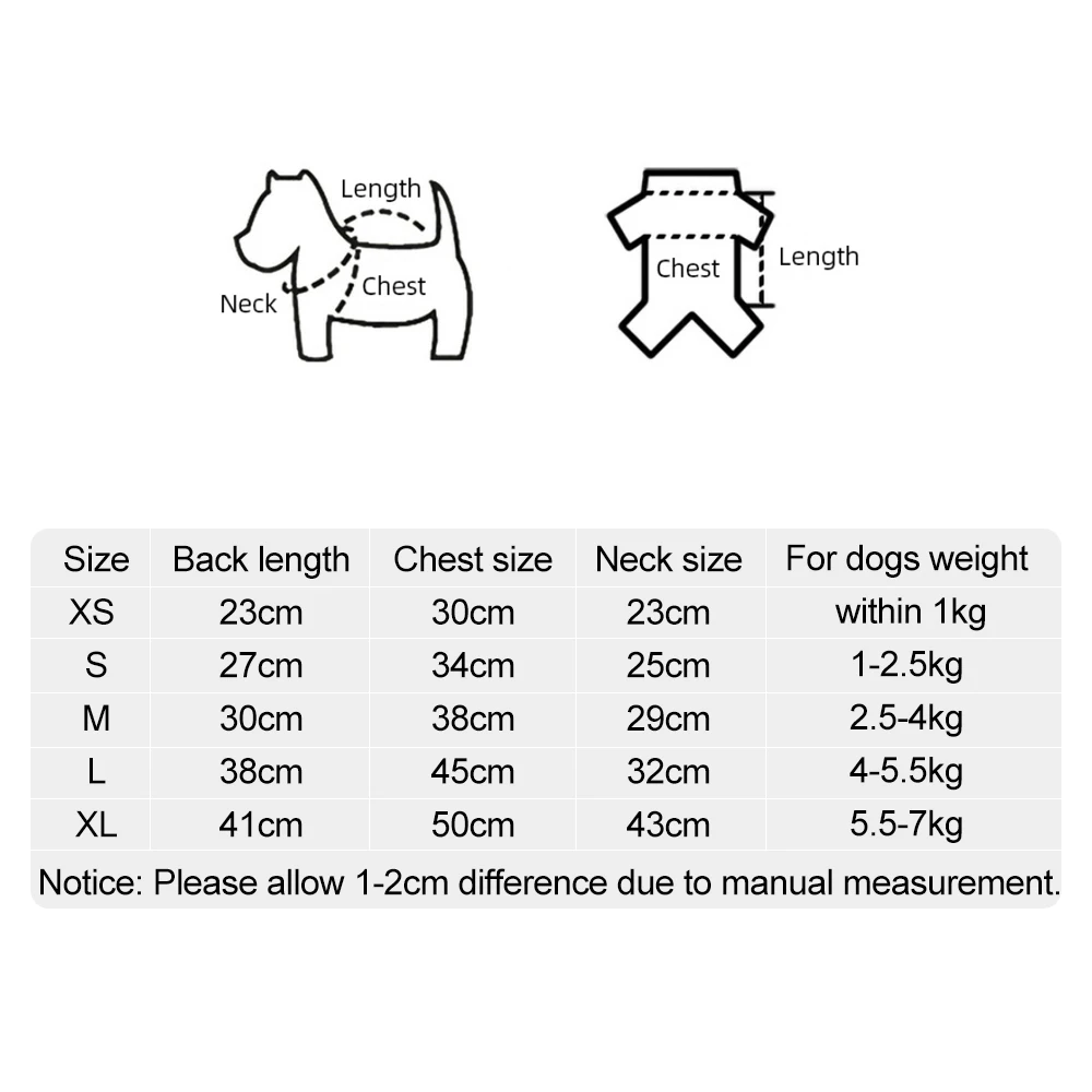 XS: длина спины: 23 см; Размер груди: 30 см; Размер шеи: 23 см; Для собак весом до 1 кг