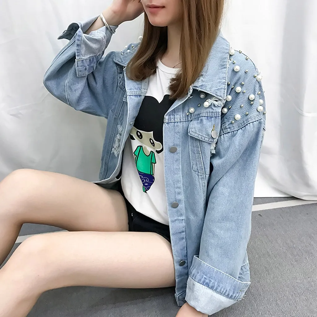 Женская джинсовая куртка на пуговицах, с длинным рукавом и жемчужными бусинами