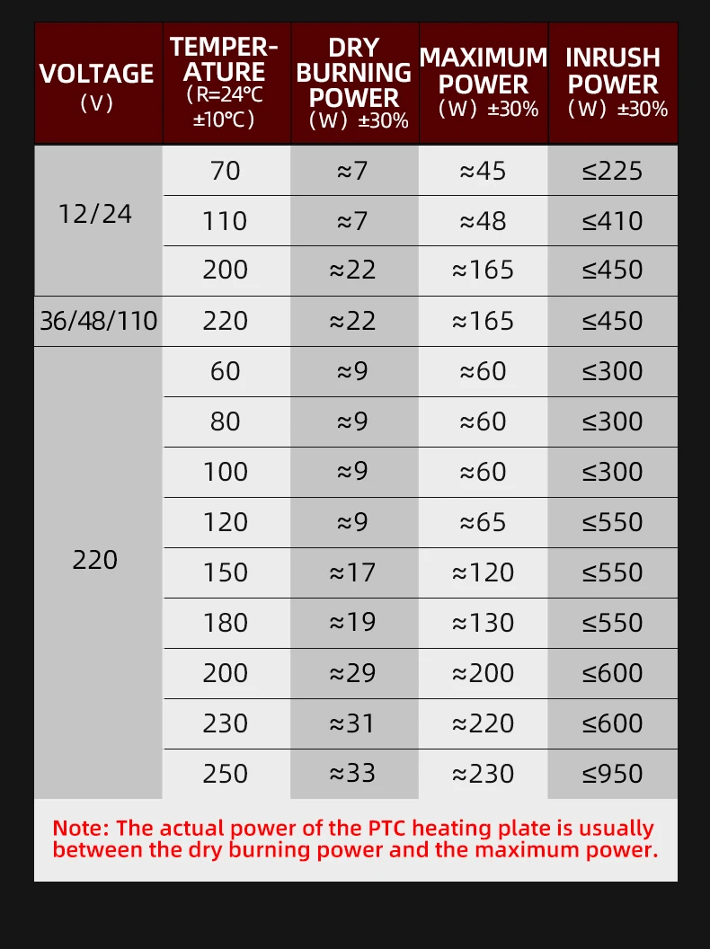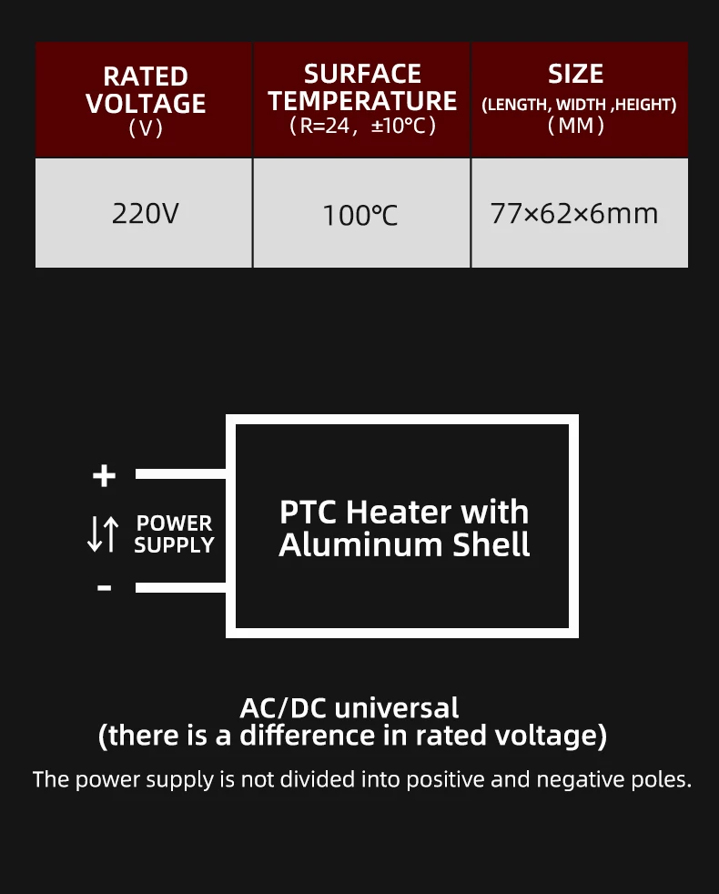 Использование: Этот PTC используется для нагрева воздуха или твердых веществ, не должен быть помещен в жидкости и подвержен воздействию большой пыли.
