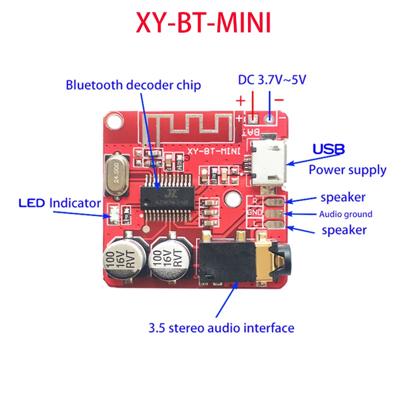 1. Интерфейс питания: Общий блок питания Micro USB 5 В 2. 3,7-5V источника питания на поверхности коврика для реализовать внешний 3,7-5V источника питания модификации 3. Интерфейс u-диска: поддерживает воспроизведение файлов MP3/WAV/APE/FLAC на u-диске, поддерживает формат файлов FAT16/32 4. Интерфейс tf-карты: поддерживает воспроизведение файлов MP3/WAV/APE/FLAC на tf-карте, поддерживает формат FAT16/32 5. Светодиодный индикатор: режим Bluetooth синий светильник включен, Режим музыки синий светильник мигает 6. 3,5 мм стерео выход: Стандартный 3,5 мм Интерфейс, выход стерео источник звука, может быть подключен к наушники, подключенные к усилитель мощности и другое оборудование