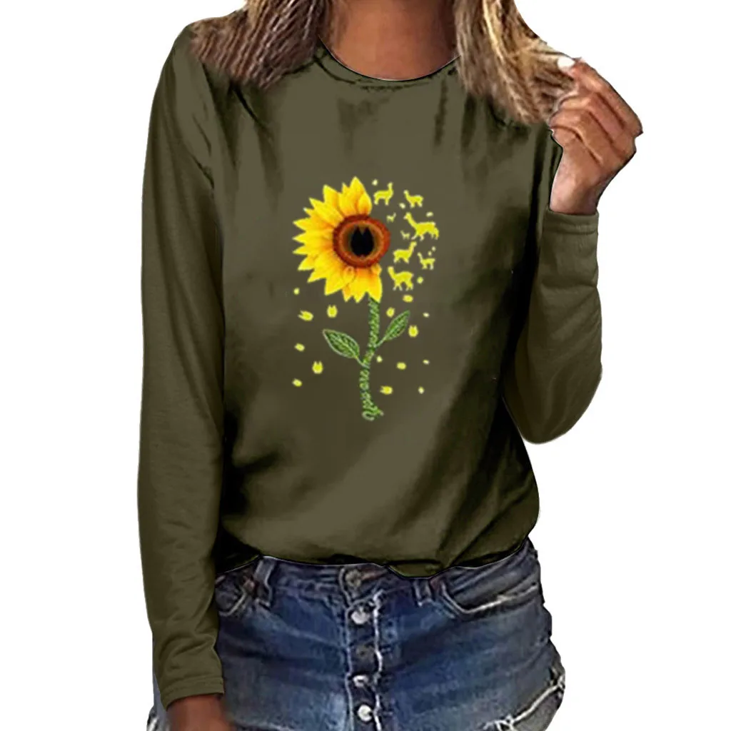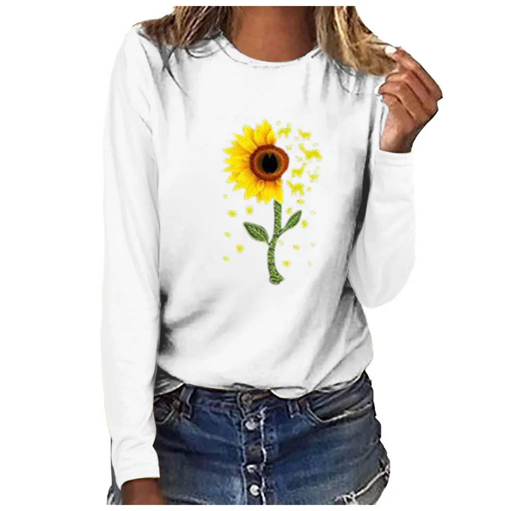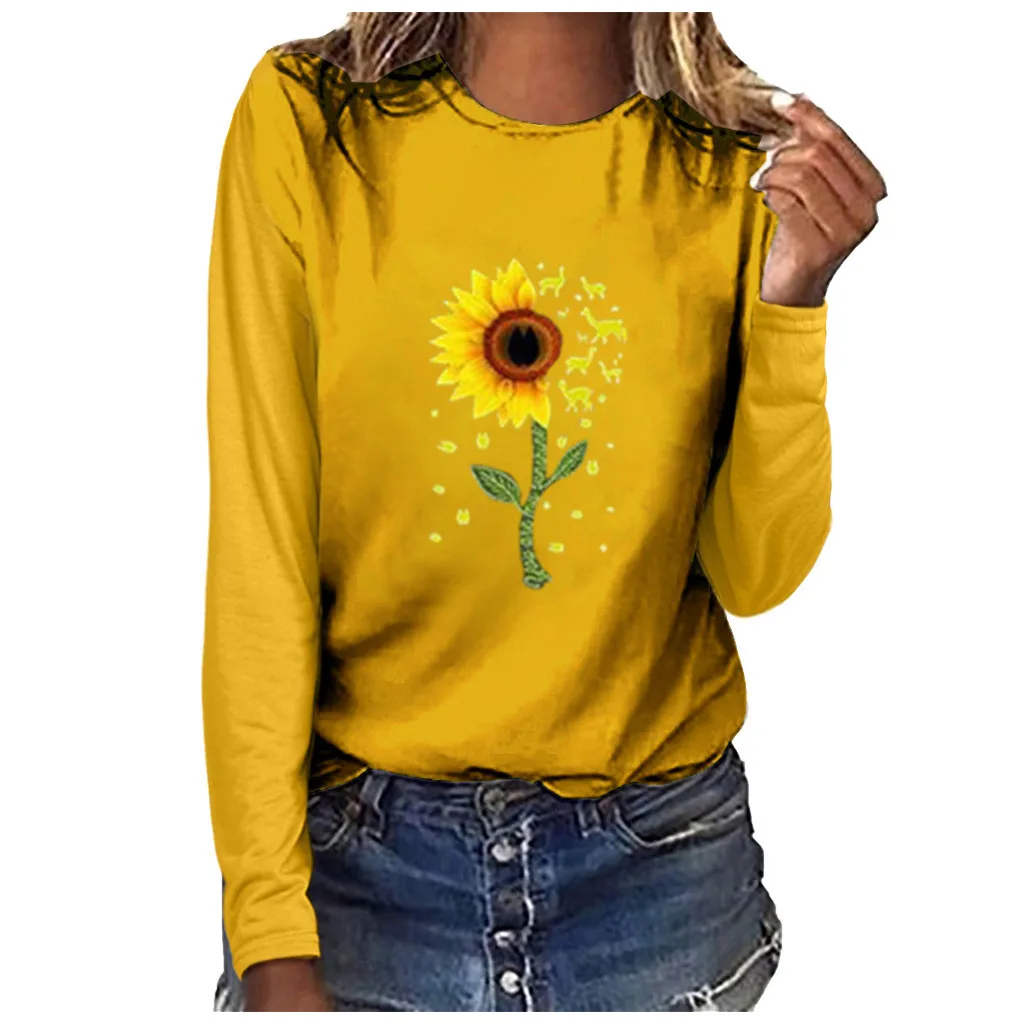 Футболка с цветочным узором и подсолнухами; топы; Женская мода; большие размеры; принт с круглым вырезом; с длинными рукавами; с круглым вырезом; poleras mujer de moda