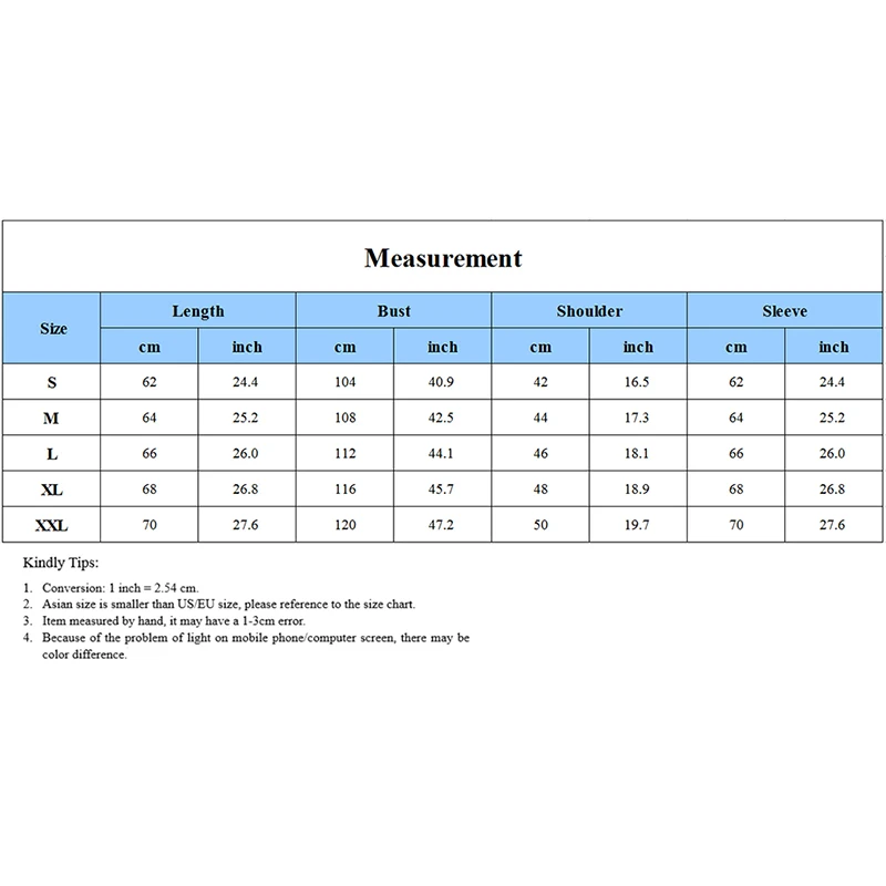 Length Sleeve Bust - - S 62cm 62cm 104cm - - M 64cm 64cm 108cm - - L 66cm 66cm 112cm - - XL 68cm 68cm 116cm - - 2XL 70cm 70cm 120cm Kindly Tip : 1. Please be reminded that due lighting effects, monitor's brightness/contrast settings etc, there could be some slight differences in the colour tone of the website's photo and the actual item. 2. Item Measure by hand, it could be 1-3cm different, your kind understanding will be much appreciated.