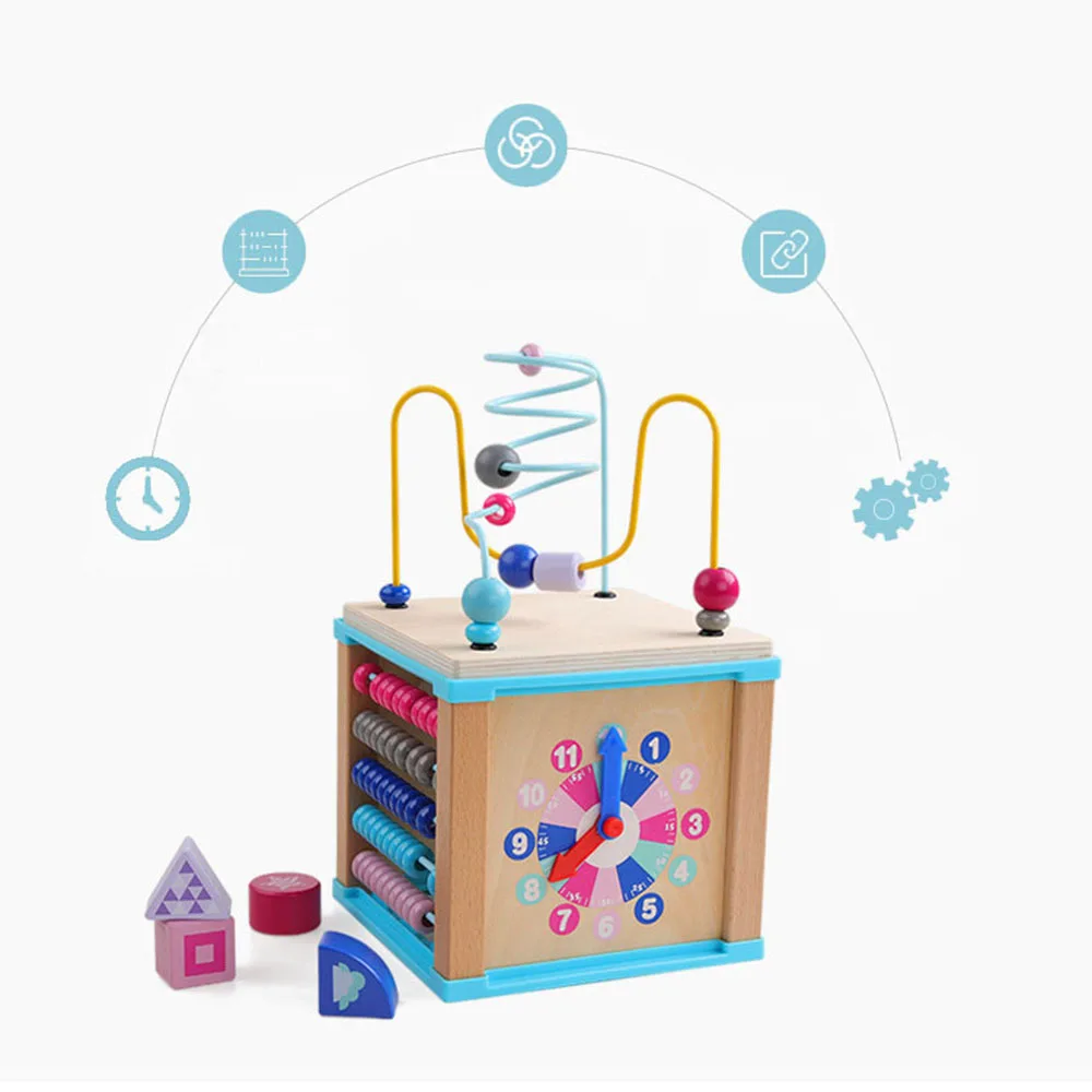 - This baby activity cube keeps child entertained with bead roll maze, time learning clock, counting alphabet and animal, rotating bells, with foot ladybug, abacus and shape sorter.