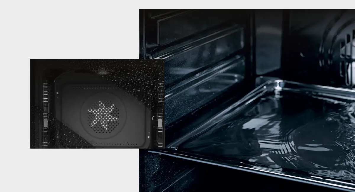 Благодаря сверхгладкой структуре эмалированного покрытия уход за духовкой осуществляется быстро, просто и эффективно. Достаточно налить 0,5 воды на противень, установить температуру 100°C и время 30 минут. После того, как пар пропитает и размягчит загрязнения на стенках духового шкафа, их нужно протереть влажной тряпкой или губкой, и поверхность станет блестящей и чистой.