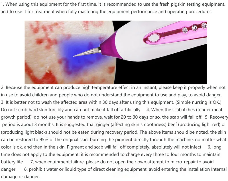 1x пятно/родинка/тату/устройство для удаления бородавок1x USB кабель5x игла1x Руководство пользователя(Упаковано в розничную коробку, подходит для подарка и домашнего использования)Особенности:NO.1 цифровой ЖК-экранNO.2 использование новейших высокотехнологичныхВысокочастотное напряжение, отсутствие ощущения тока, отсутствие боли.NO.3 девять передач6 различных уровней мощности можно регулировать, просто и надежно.NO.4 синий прожекторNO.5 Уникальная Электрическая ионная технологияБез удара электрическим током, без повреждений, без кровопролитияNO.6 перезаряжаемыйАккумулятор большой емкости может работать более 5 часов после зарядки.NO.7 обновление чипа машиныФункции:1. Удаление родинок2. Удалите татуировку3. Удаление бородавки (verruca)4. Удаление веснушек, пятен, веснушек5. Удалите мясистый невус
