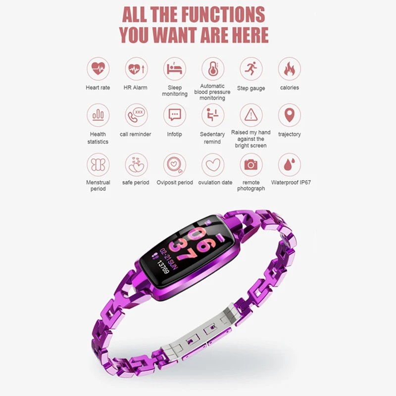 Мониторинг сердечного ритма, шагомер, калории, монитор сна, напоминание о звонках (например, SMS, QQ и WeChat) напоминание о сидячем положении, напоминание о тревоге, режим мульти-спорта (бег, Скакалка, верховая езда, бадминтон, плавание, теннис, Настольный теннис) отказ от входящего вызова, встряхивание и сфотографирование, физиологическое воздействие женского цикла