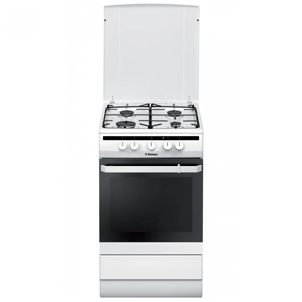 Плита газовая. Ширина - 50см, 4 газовых конфорки (1х4,0см, 2х6,5см, 1х9,0см), газовая духовка, металлическая крышка, ящик для посуды на роликах, цвет белый.