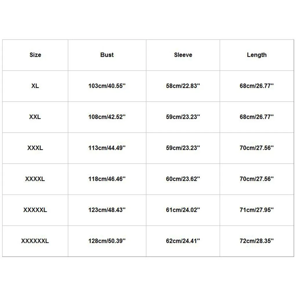 РазмерБюстРукавДлинаXL103 см/40,55''58 см/22,83''68 см/26,77''XXL108 см/42,52''59 см/23,23''68 см/26,77''XXXL113 см/44,49''59 см/23,23''70 см/27,56''XXXXL118 см/46,46''60 см/23,62''70 см/27,56''XXXXXL123 см/48,43''61 см/24,02''71 см/27,95''XXXXXXL128 см/50,39''62 см/24,41''72 см/28,35''